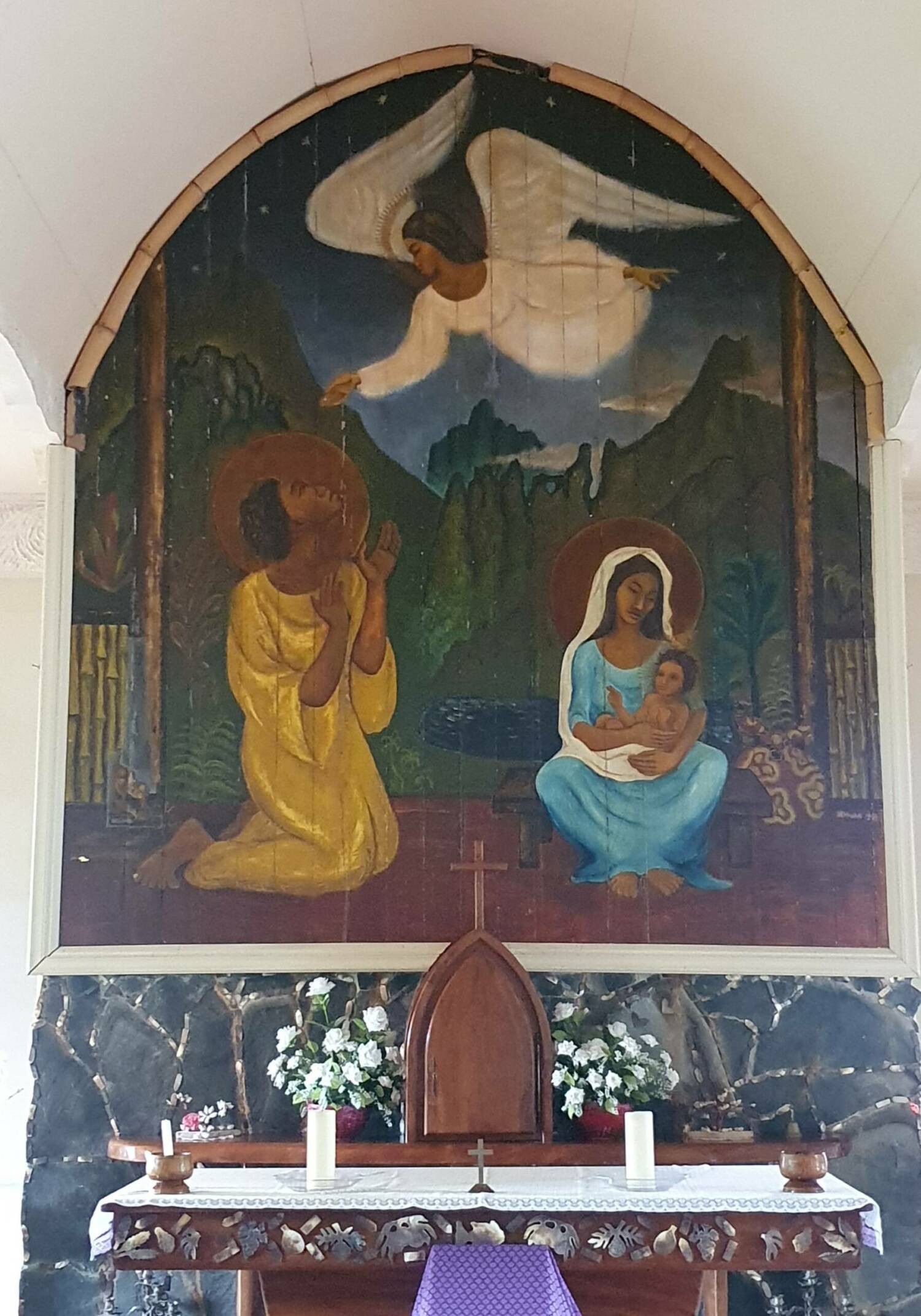 L’œuvre peinte par Peter Heyman en 1948, intitulée La Fuite en Égypte, est un témoignage original de la rencontre entre l’art chrétien et la culture polynésienne. Cette oeuvre représente la Sainte Famille fuyant vers l’Égypte, mais avec des visages de Polynésiens, ceux des paroissiens locaux. Elle est peinte directement sur un bardage de bois, dans un style inédit à l’époque, avec des personnages bibliques placés dans un fare, une maison traditionnelle polynésienne. En arrière-plan, le paysage caractéristique de Mo’orea avec ses montagnes se mêle à cette scène religieuse, apportant une touche locale inédite. L’oeuvre a été réalisée sur l’initiative du père Daniel Egron et fut approuvée par le pape Pie XII, devenant ainsi un symbole de l’adaptation de la foi chrétienne aux réalités culturelles locales.