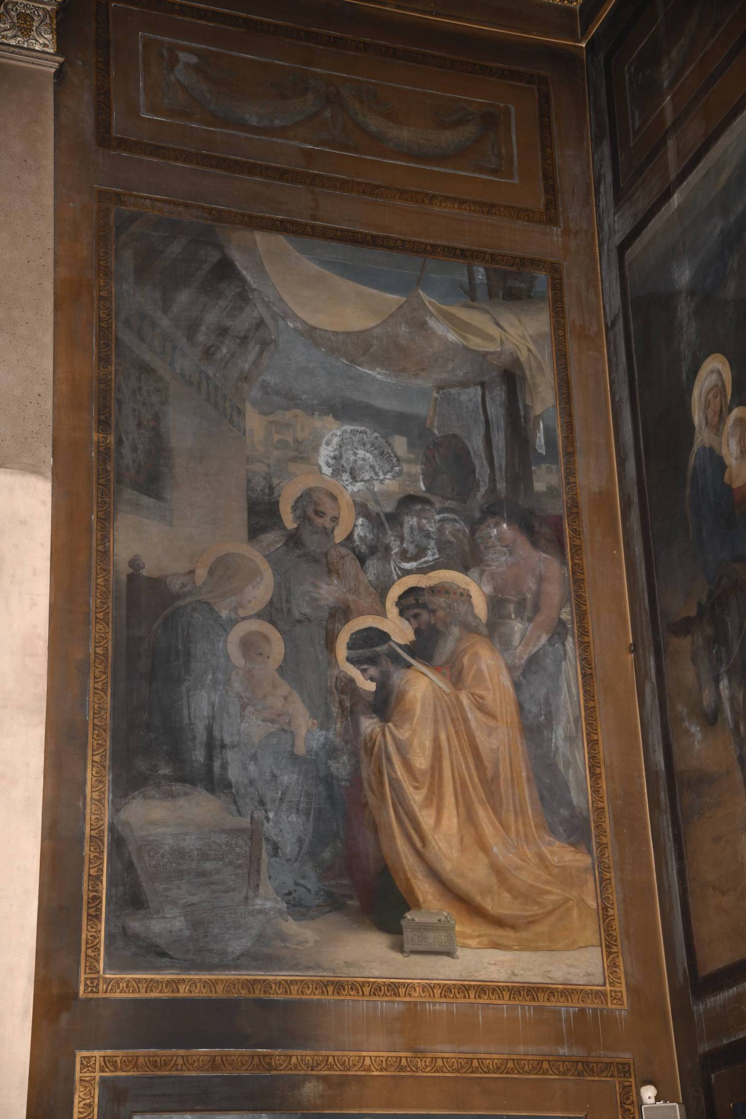 Sous la Troisième République (1870-1940) la commande publique est en effervescence et s’enracine dans une longue tradition académique, dont Bouguereau est l’un des représentants majeurs de son temps. Cependant, la seconde moitié du XIXe siècle coïncide également avec un basculement progressif de la hiérarchie des genres : la peinture religieuse autrefois noble, est reléguée comme simple scène de genre. Et cela, non sans lien avec la laïcisation du régime en place, qui aboutira en 1905 à la séparation de l’Église et de l’État. Bouguereau, qui avait pour habitude lors du Salon annuel, d’exposer, à la fois une peinture à sujet mythologique et une peinture à sujet religieux, obtient une médaille d’honneur pour ce diptyque sur le thème de l’Adoration, non sans susciter la controverse. La critique s’est en effet montrée réservée quant à l’aspect novateur dans le choix du sujet et dans le rendu de ces deux toiles à un moment où, l’Impressionnisme existe déjà. C’est finalement à l’issue de ce Salon que le cycle de la Vierge a été minutieusement marouflée sur l’un des murs de fond de la chapelle. De nos jours, ces œuvres constituent de véritables témoins de ce qu’était la peinture religieuse en France dans le dernier quart du XIXe siècle.