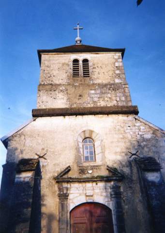 Le clocher-porche saillant sur la façade serait la partie la plus ancienne de l’édifice. Mais il s’agit d’un élément très composite : le portail est une reconstruction de l’époque classique, caractéristique avec son fronton coupé porté par des pilastres à chapiteaux toscans. L’étage supérieur est éclairé par une fenêtre en plein cintre, l’intérieur est voûté sur croisée d’ogives. La section des ogives très sobre (un simple cavet) évoque une construction du XIVe s., donc contemporaine du gros œuvre de l’église. L’étage des cloches est ouvert à l’ouest par une baie géminée, au sud et au nord par des baies simples en plein-cintre. Le clocher n’a pas été surélevé comme beaucoup d’autres l’ont été aux XVIIIe et XIXe s. en Franche-Comté et le pavillon lui-même reste peu élevé. Le beffroi a été refait en 1840.