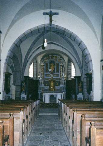 La nef comprend deux travées couvertes de voûtes d’arêtes, séparées par un arc doubleau reposant sur des consoles. Cette disposition est due manifestement à la présence des ouvertures des chapelles qui interdisaient l’utilisation de supports partant du sol. Ces voûtes d’arêtes sont d’époque classique et remplacèrent peut-être une couverture à charpente apparente ou lambrissée. La travée de chœur est la partie la mieux conservée de l’édifice du XIVe s., avec sa croisée d’ogives solide, aux branches ornées d’un large cavet et reposant aux angles sur des culots à décors géométriques. La présence d’arcs formerets peut laisser penser que cette travée était fermée par un chevet droit. L’édifice se termine maintenant à l’est par une abside à cinq pans voûtée d’arêtes qui, extérieurement et intérieurement, possède toutes les caractéristiques d’une construction du XVIIIe siècle. Elle est éclairée par deux larges fenêtres en plein cintre ouvertes dans les pans coupés, tandis que le mur oriental reste aveugle pour recevoir un retable monumental.