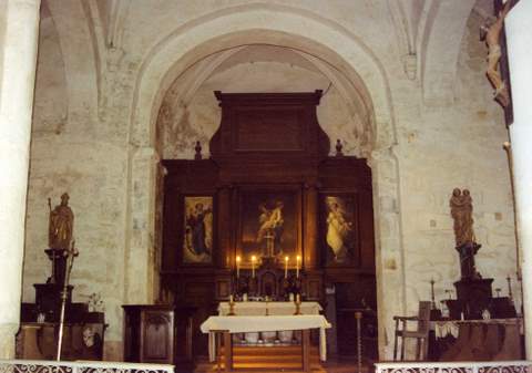 La travée orientale du chœur possède un chevet plat aveugle. Elle est couverte d’une voûte d’ogives barlongue sur culots, analogue à celle de la travée suivante ; cette dernière couvre une travée romane qui communique par des arcades en plein cintre avec d’étroits collatéraux voûtés en demi-berceau. On y voit des traces de peintures murales très peu dégagées ou à peine apparentes sous un enduit de chaux, gothiques elles aussi, semble-t-il.