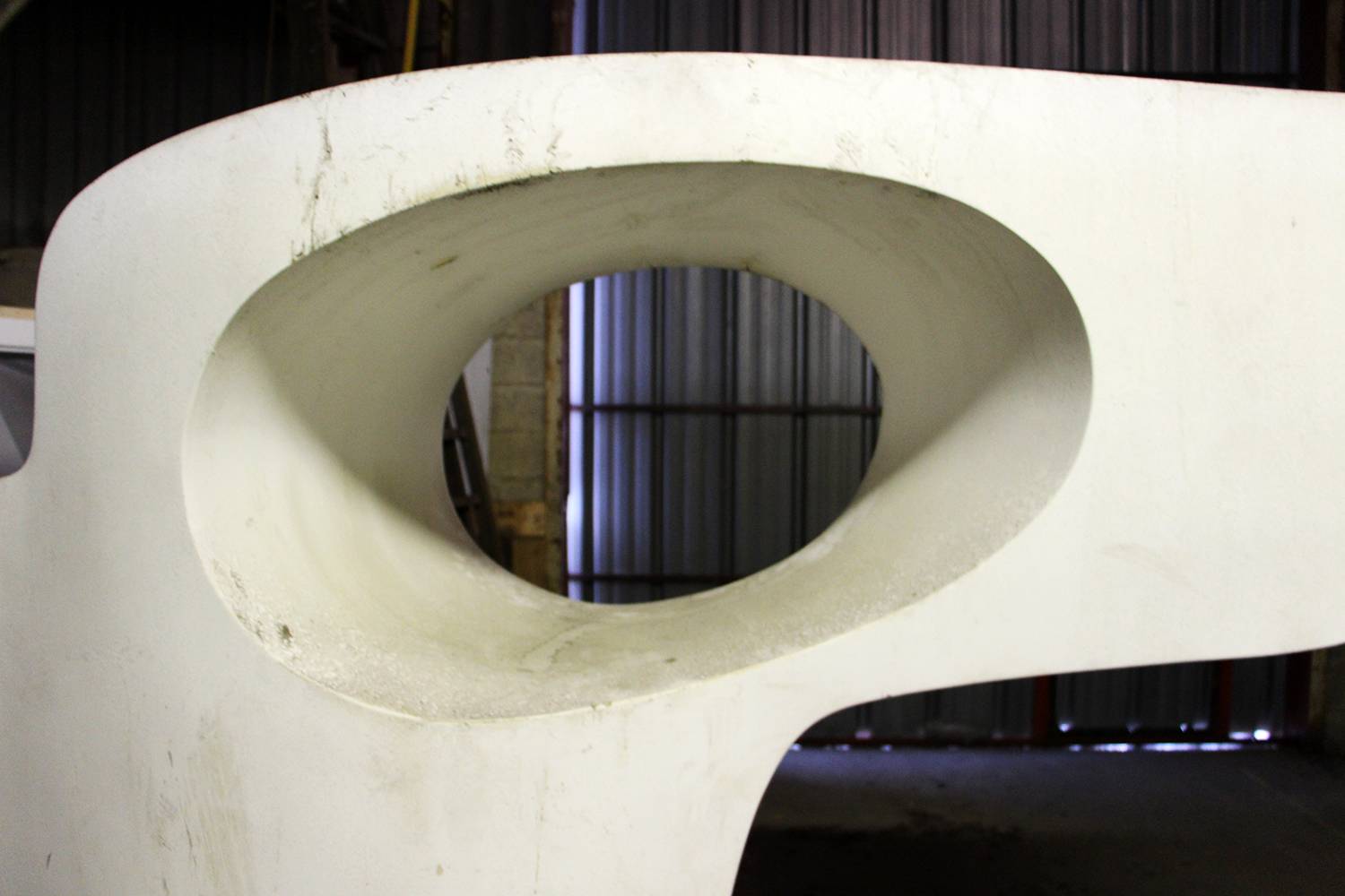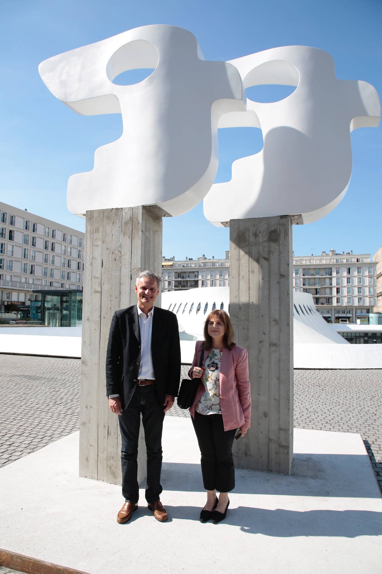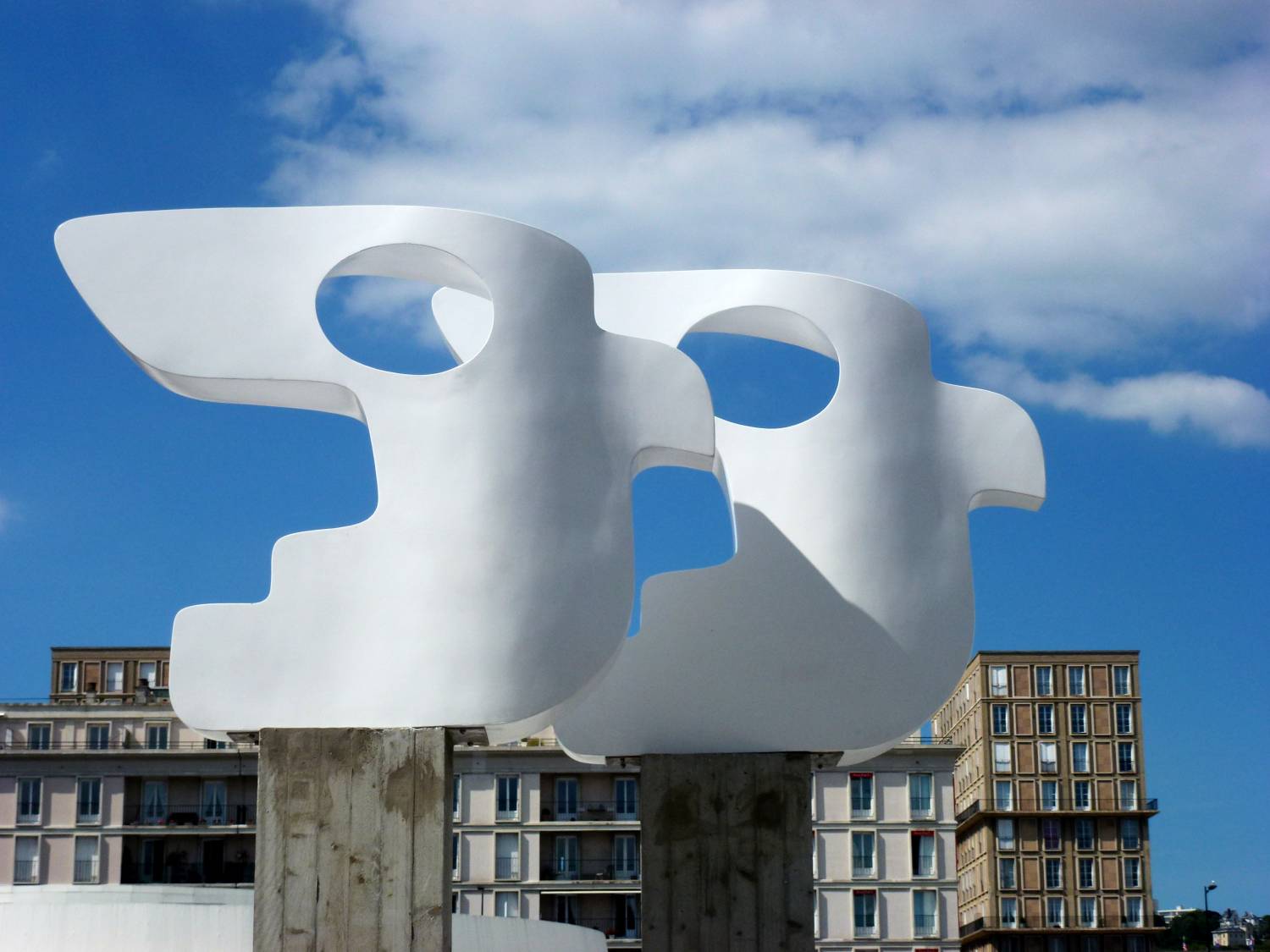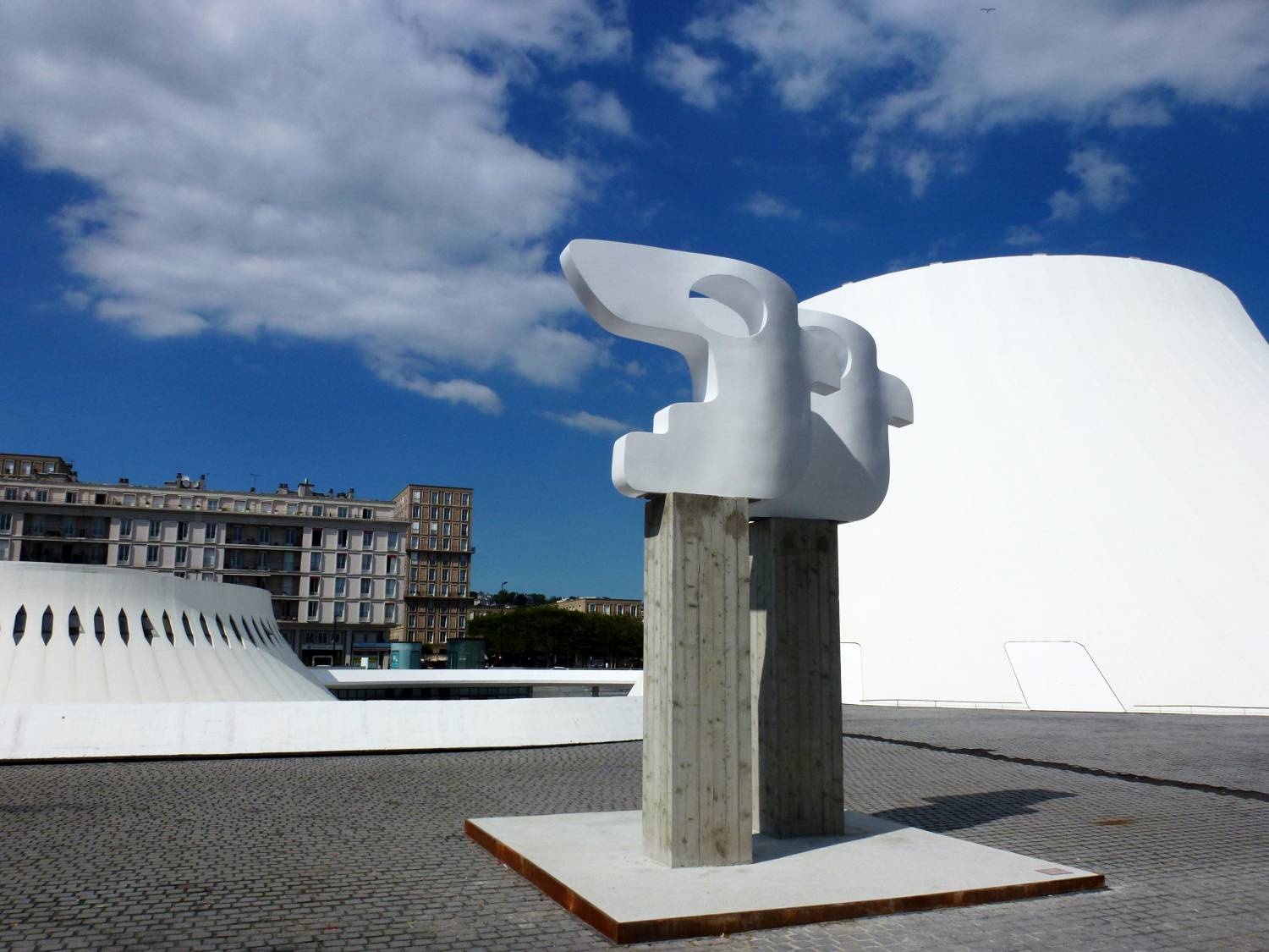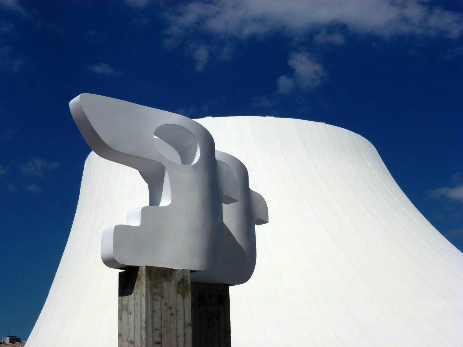 Chaque oiseau présente dans l’aile un trou en forme d’œuf, de telle sorte que la lumière traverse l’œuvre. Ce souci de la relation des œuvres et de la lumière vaut à Marianne Peretti d’être qualifiée de « dompteuse de lumière »3. La sculpture, légère, malgré ses dimensions, ne bloque pas la vue grâce à ce jeu de vides et de pleins. Le paysage semble comme cerclé par la sculpture, comme s’il faisait partie intégrante de l’œuvre. La forme de l’œuf, fortement symbolique, évoque la naissance, le renouveau et le retour cyclique. Les courbes des oiseaux rappellent l’architecture toute en rondeur de l’espace Niemeyer qui forme une colombe vue du ciel. Les deux oiseaux renforcent ainsi le symbole de la paix tandis qu’ils constituent un oxymore visuel avec le Volcan : le doux symbole de la paix face à la violence du feu. Ils évoquent également les liens du port du Havre avec les Amériques. Le voyage est celui des hommes comme Marianne Peretti le faisait régulièrement du Havre pour se rendre au Brésil mais aussi celui des idées, des valeurs et des marchandises. Enfin, l’oiseau pour Marianne Peretti est d’abord un motif qu’elle aime représenter et que l’on retrouve souvent dans son œuvre. L’oiseau représente la liberté – artistique et politique, droit que chérit et revendique l’artiste dans le contexte d’une difficile construction de la démocratie au Brésil.
