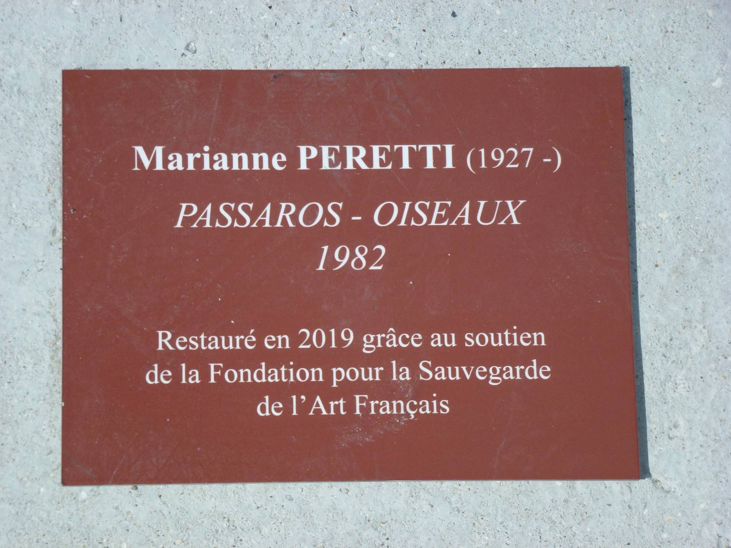 Passaros, Les Oiseaux en portugais, est une sculpture réalisée au Havre, par Marianne Peretti, une artiste franco-brésilienne (née en 1927). L’œuvre, en résine polyester teintée en blanc mat, est composée de deux oiseaux d’1,80 mètres de longueur sur 2,25 mètres de largeur chacun. Ils sont juchés sur des colonnes elles-mêmes posées sur une dalle. La sculpture est intégrée au « Volcan»1, un ensemble architectural conçu par l’architecte brésilien Oscar Niemeyer (1907 – 2012) qui comporte une bibliothèque et une grande salle de théâtre et de concert.