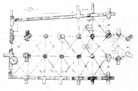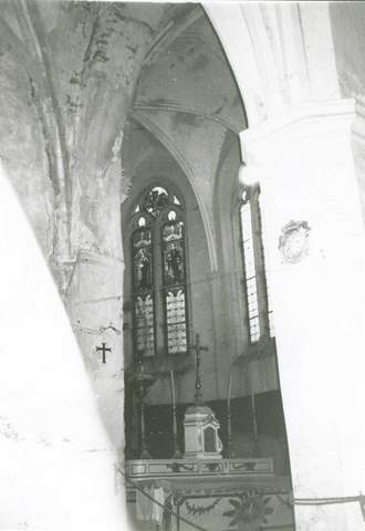 La croisée du transept semble dater du xiiie s., alors que le reste de l’édifice appartient plutôt à la fin du xve ou au xvie s. De cette époque date également les fragments de vitraux anciens qui garnissent les fenêtres nord du chœur. L’ensemble du bâtiment est voûté sur croisées d’ogives avec quelques belles clés sculptées.