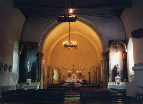 L’église orientée, placée sous le vocable de saint Pierre-aux-Liens, est un modeste édifice qui remonte vraisemblablement au XIIème siècle, mais qui a subi des modifications importantes au cours du XVIIème siècle. Elle se compose d’une nef unique plafonnée et d’un chœur carré également plafonné qui devait, autrefois, se terminer par une abside semi-circulaire.