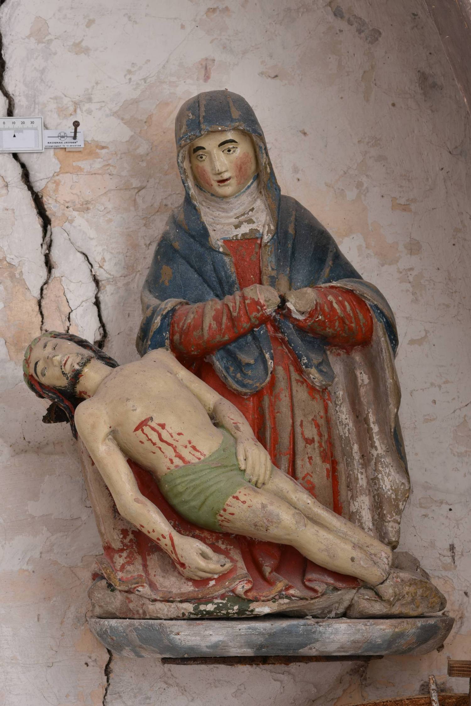 Il y a quelque temps la pietà a subi une restauration malheureuse au niveau du visage et jure avec le reste de l’œuvre. Elle est très abîmée mais encore récupérable, à condition d’agir vite. En plus de la restauration des volumes et des couleurs encrassées, il faudrait la traiter contre les insectes xylophages.