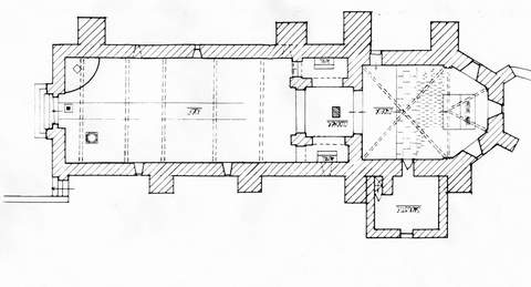 L’église se compose d’une nef d’un grand volume dont les entraits de la voûte dessinent cinq travées, d’un faux carré surmonté du clocher et d’un chœur constitué en une travée droite et une abside à trois pans. Au sud, une sacristie a été rajoutée au XIXesiècle. De puissants contreforts épaulent toute la périphérie de l’édifice dont l’implantation sur un terrain en pente engendre des désordres dans la maçonnerie. La nef est percée de petites ouvertures étroites cintrées qui témoignent de l’ancienneté des murs gouttereaux.
