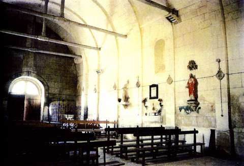 Á l’intérieur, la nef était couverte d’une voûte en briques hourdée de plâtre en forme de berceau et scandée de larges doubleaux. Ce voûtement très tardif est venu « enrichir » une nef à l’origine simplement charpentée. Cependant il s’est effondré en octobre 2005, provoquant dans sa chute la rupture d’un entrait. Le chœur a lui aussi été voûté à la même époque de voûtes sur croisées d’ogives en briques qui ont, là aussi, remplacé un lattis ancien enduit de chaux, dont certains vestiges sont encore visibles sous les combles. C’est durant cette même campagne de travaux que le maître-autel, doté de part et d’autre d’autels latéraux, a été installé dans le faux carré du transept. Ce dernier est couvert d’une voûte en pierre en berceau, ceinte d’une corniche à modillons de l’époque romane.