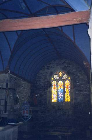 Les vitraux actuels, en dalles de verre, ont été posés en 1978-1980. Les cartons sont l’œuvre d’Annick Queffélec, peintre de Plonévez-du-Faou. La baie 0 porte toute une symbolique de la fécondation de la terre après le Déluge (oiseau, fleurs, rayons du soleil) ; la baie 1 représente le feu (brasier) ; la baie 2 représente des thèmes évoquant l’eucharistie (grappe de raisin-calice, pêche miraculeuse, blé-ciboire).