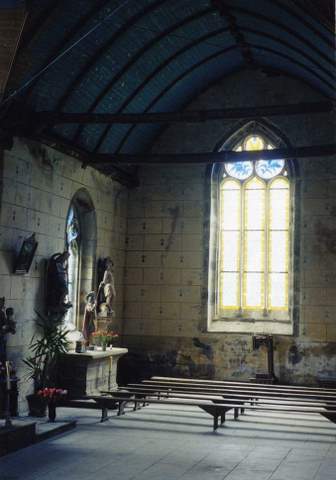 L’intérieur est éclairé par sept fenêtres (trois au sud, trois à l’est, une seule au nord) qui portent toutes des remplages du xvie s., mais dont les vitraux anciens ont disparu. Les murs sont couverts d’un enduit sur lequel ont été peintes des hermines. La charpente est cachée par un lambris dont les nombreux couvre-joints reposent sur des sablières sculptées et peintes : on peut y voir des têtes de personnages et des scènes variées, comme celle où l’on voit un homme qu’un dragon s’apprête à avaler mais qui est secouru par deux femmes, l’une d’elles agrippant l’homme par les cheveux, l’autre tirant la queue du dragon. Des entraits à engoulants consolident la construction dans la nef et les bras du transept.