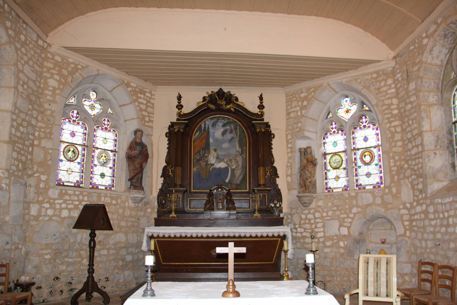 La nef, percée de baies en anse de panier et décorées de vitraux, est couverte en bâtière tandis que le chœur se termine en croupe. Le chœur, quant à lui, est percé de baies en arc brisé à remplage et est épaulé deux contreforts angulaires. Le couvrement est lambrissé et la maçonnerie est constituée de pierre calcaire, de moellon, brique et silex.