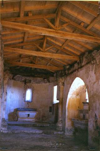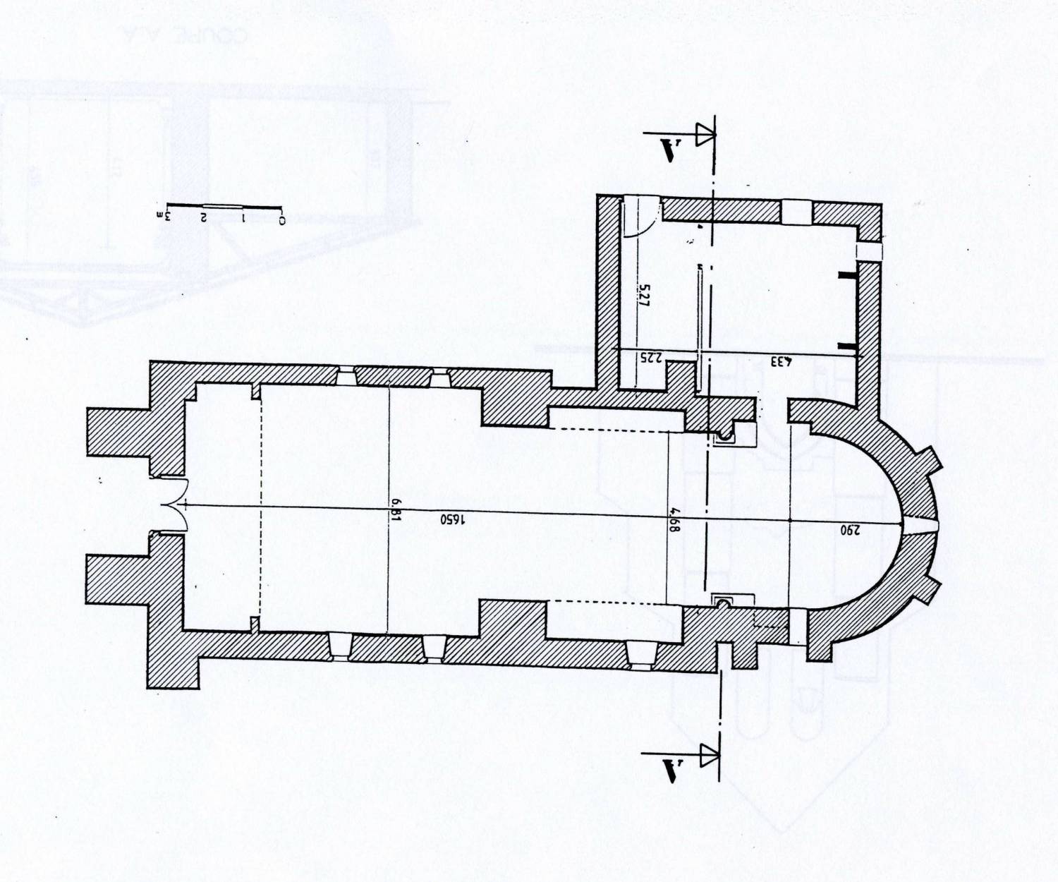 De la construction du XIIe s., on a perdu la voûte, dont seules subsistent quelques traces (première travée de la nef). Il demeure de cet ensemble les demi-colonnes et les chapiteaux qui supportaient l’arc triomphal. Leur ornementation de feuilles à boules et crochets et, pour l’un d’eux, de lions souriants, remonte également à cette époque, mais a fait l’objet d’une restauration plus que probable au XIXe siècle. Le chevet est maintenu par de solides contreforts, de construction et de profil soignés. On a fait des adjonctions aujourd’hui disparues, et surtout, à la fin du XVe s. ou au début du XVIe s., on a construit le clocher-arcade à pignon aigu et le portail occidental, d’un intéressant profil à gorge profonde. De minces baies gothiques élégamment dessinées (ébrasements et remplage à un seul lobe très resserré) éclairent la nef du côté nord. Du XIXe s., il convient de relever un autel de pierre sculpté avec son tabernacle, le tout exécuté probablement sous la Restauration.