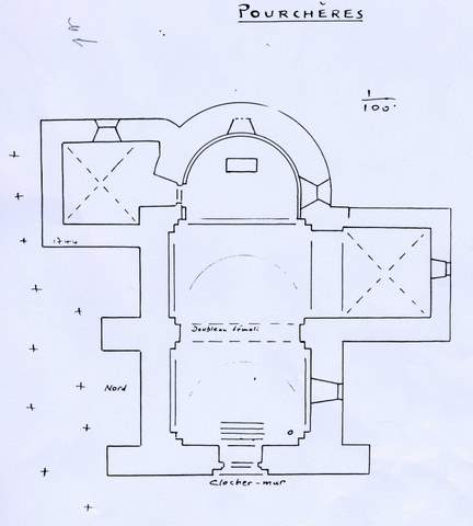 En élévation, les murs de la nef sont intérieurement doublés d’arcs de décharge en plein cintre surmontés d’une corniche qui se poursuit dans l’hémicycle du chevet. Une fenêtre au sud éclaire la première travée, l’arc de décharge de la deuxième travée à droite a été ouvert pour donner accès à la chapelle XVIIIe. Le chevet était éclairé par une fenêtre d’axe aujourd’hui murée.