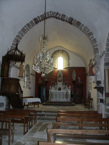 L’intérieur, nef comme chapelles, est voûté en berceau, reposant sur une corniche saillante en quart de rond ; il reçoit la lumière de quatre baies et de deux oculi à l’ouest. Les travées sont marquées par deux arcs doubleaux reposant sur des colonnes engagées dont les bases sont moulurées et les chapiteaux décorés de crochets et larges tailloirs. Une tribune en charpente occupe la première travée. L’ensemble du mobilier conservé (autels, chaire, fonts baptismaux, dans le style néo-gothique) remonte à la deuxième moitié du XIXe et au début du XXe s., mais de nombreux vestiges sculptés du XVIIIe s., sans doute contemporains de l’érection des chapelles, prouvent que l’église fut alors non seulement agrandie, mais aussi dotée de nouveaux retables et statues.