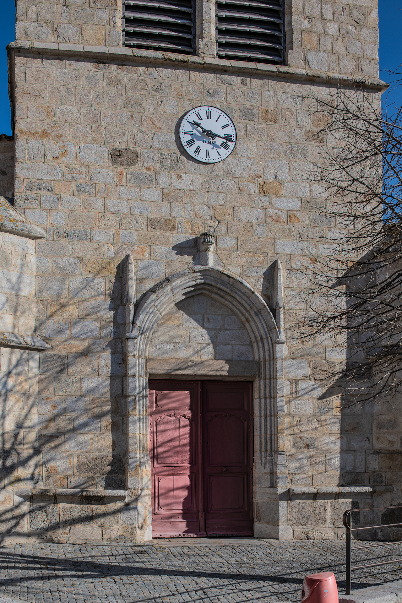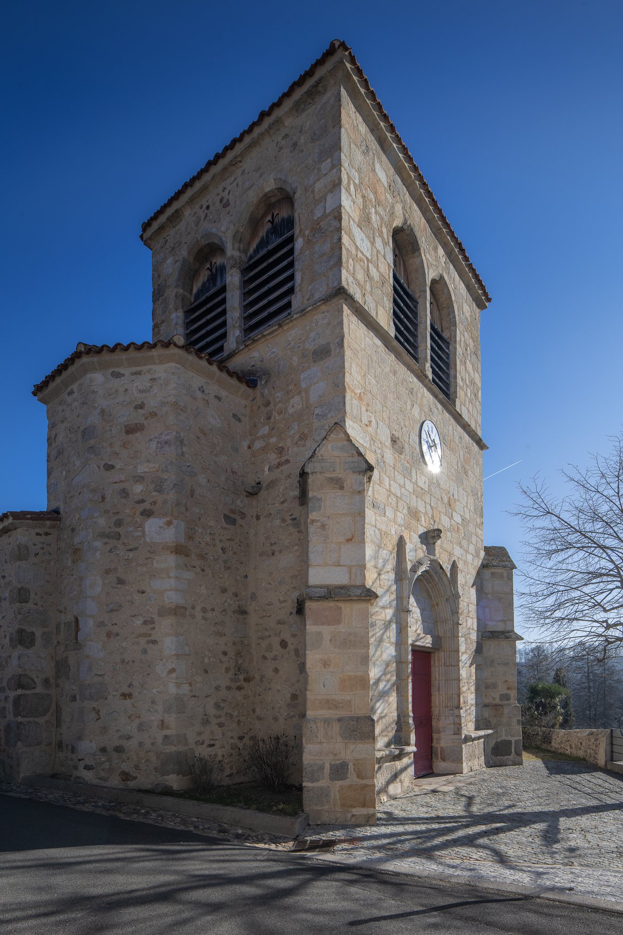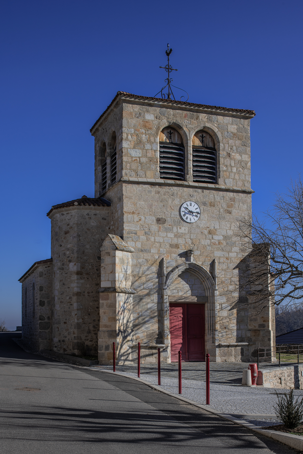 Au début du XVIe s., une tour-clocher servant de porche a été ajoutée à l’ouest : le linteau du portail d’entrée porte la date de MVCXXXV (un pilier intérieur annonce une autre date : 1566). C’est cette tour-clocher qui donne son caractère à l’édifice et l’inscrit dans la belle série des églises du « gothique tardif forézien » comme les exemples tout proches de Chazelles-sur-Lavieu, de Saint-Laurent-Rochefort (1) , et Saint-Germain-Laval (2) : il en possède certains éléments : contreforts angulaires, portail à voussures et à pinacles latéraux, sobre façade de pierre de taille, bancs de pierre encadrant le portail. Peu de décors, ou disparus : une statue devait surmonter la console au-dessus de l’arcade d’entrée, et le tympan a pu être peint. L’escalier d’accès, au nord, est hors œuvre.