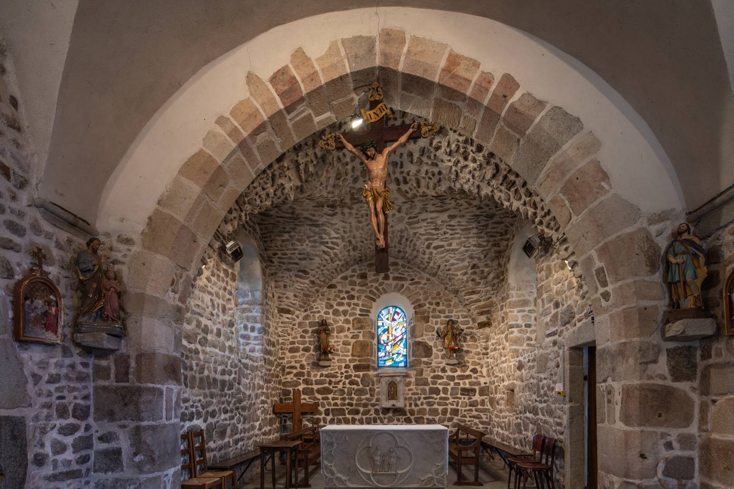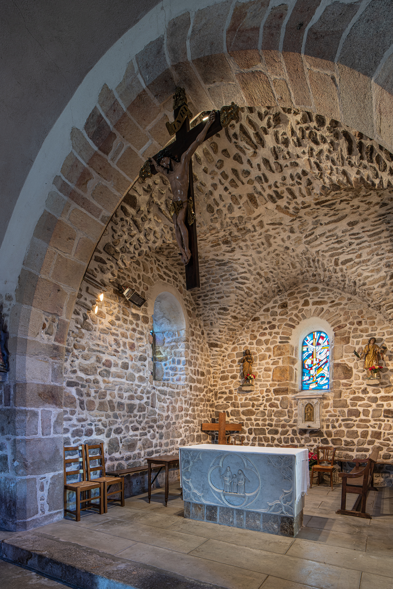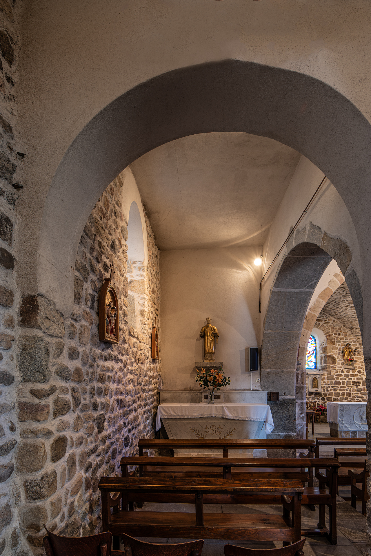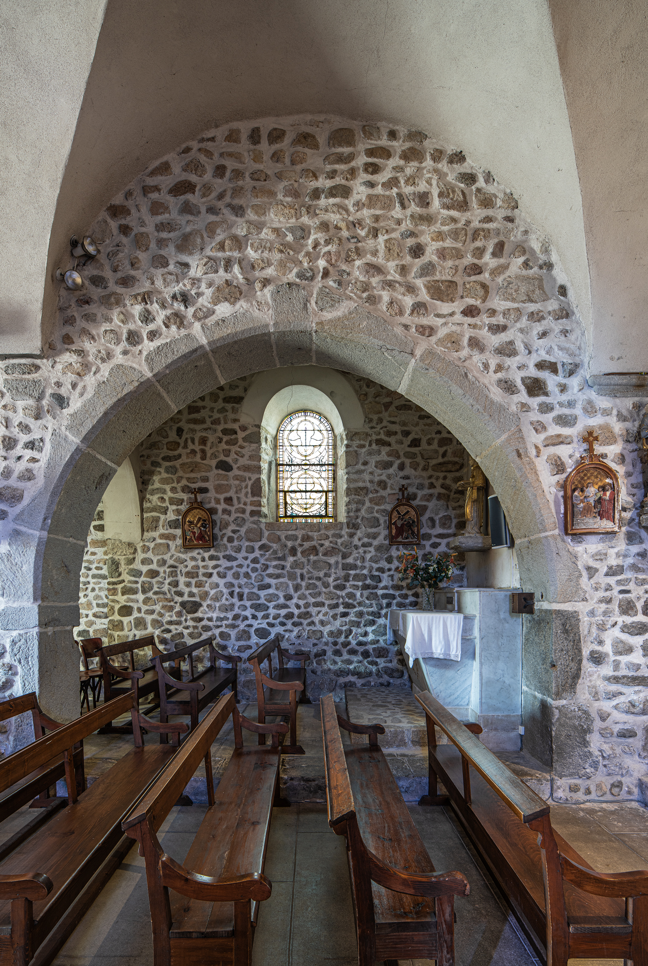 À l’intérieur, les aménagements des années 60 ont enlevé partout les enduits et mis la pierre à nu ; seules méritaient de l’être les pierres de taille des arcades : l’arc triomphal et les deux arcs des chapelles de la première travée.