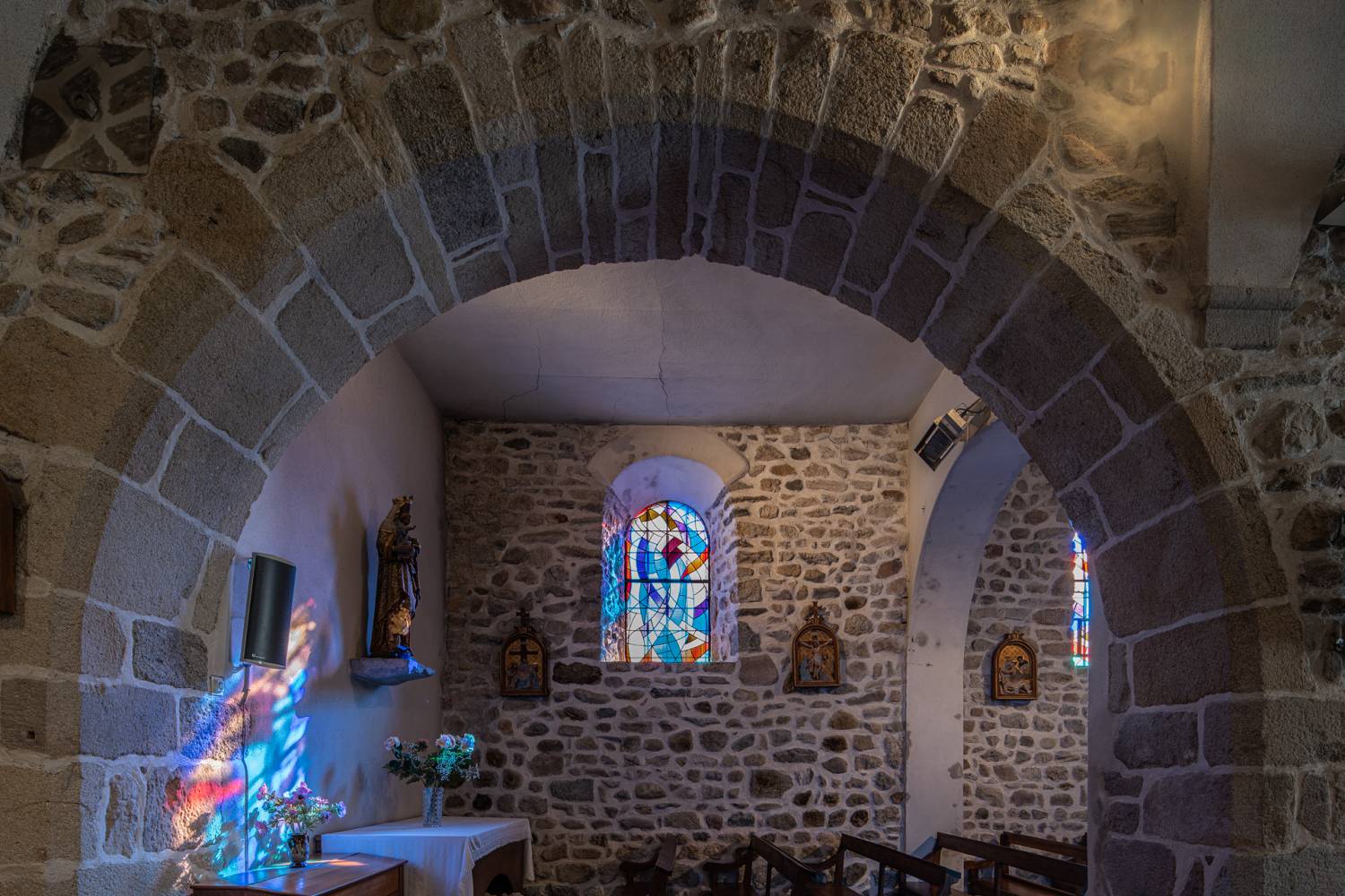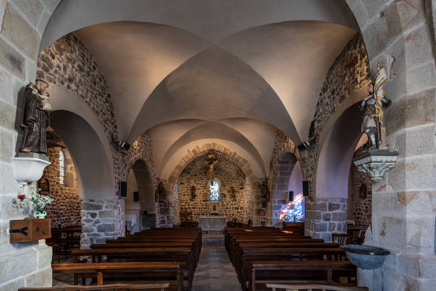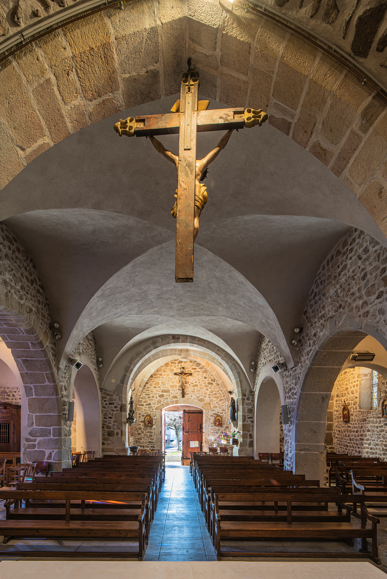 À l’intérieur, les aménagements des années 60 ont enlevé partout les enduits et mis la pierre à nu ; seules méritaient de l’être les pierres de taille des arcades : l’arc triomphal et les deux arcs des chapelles de la première travée.