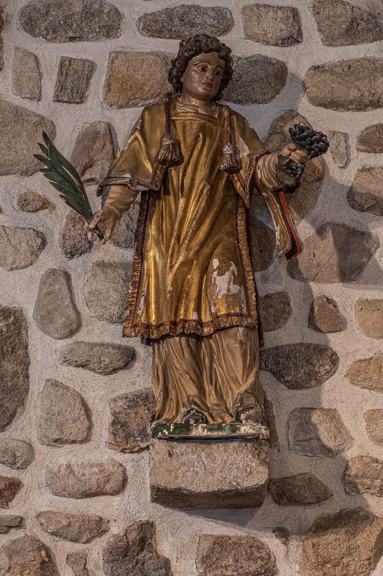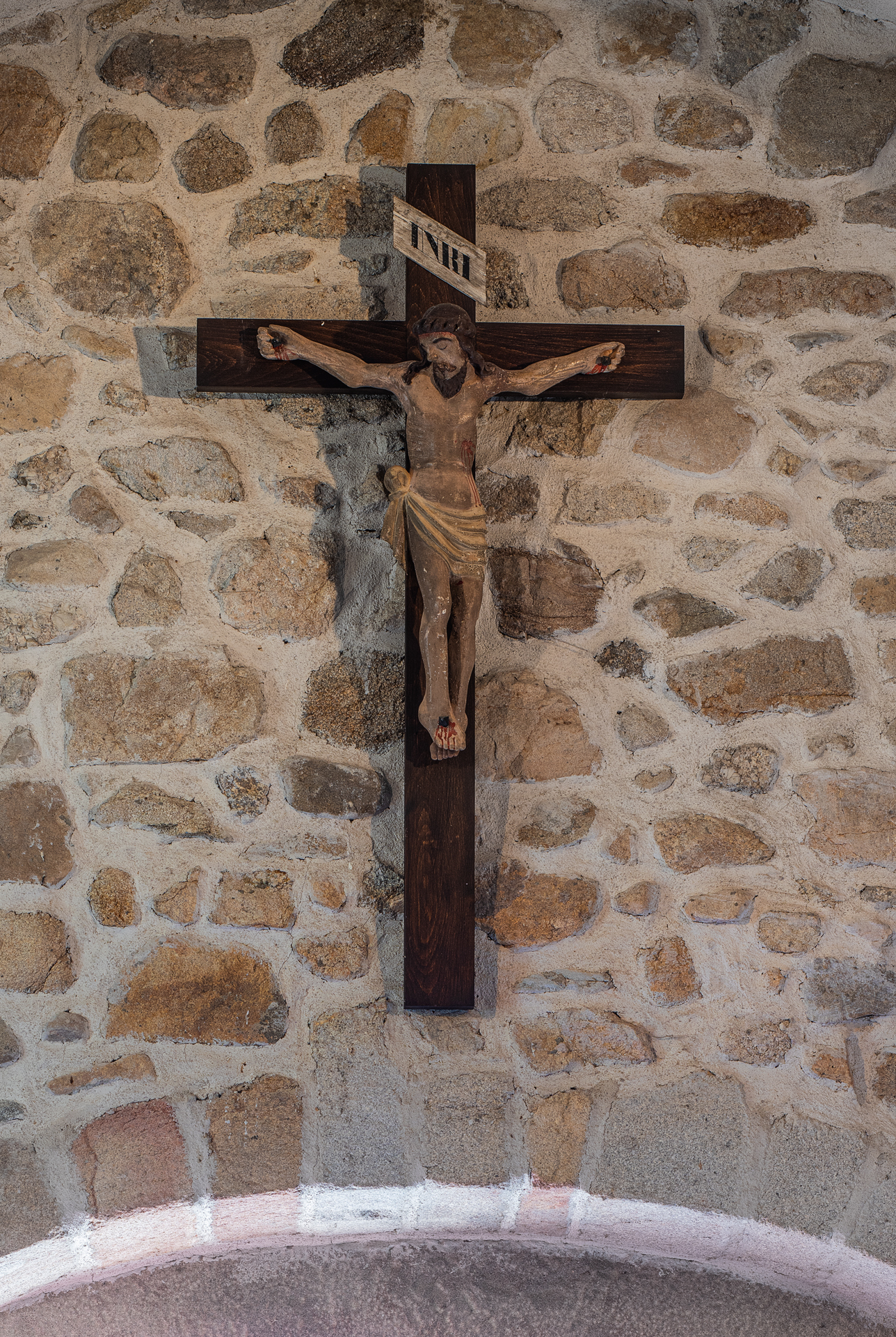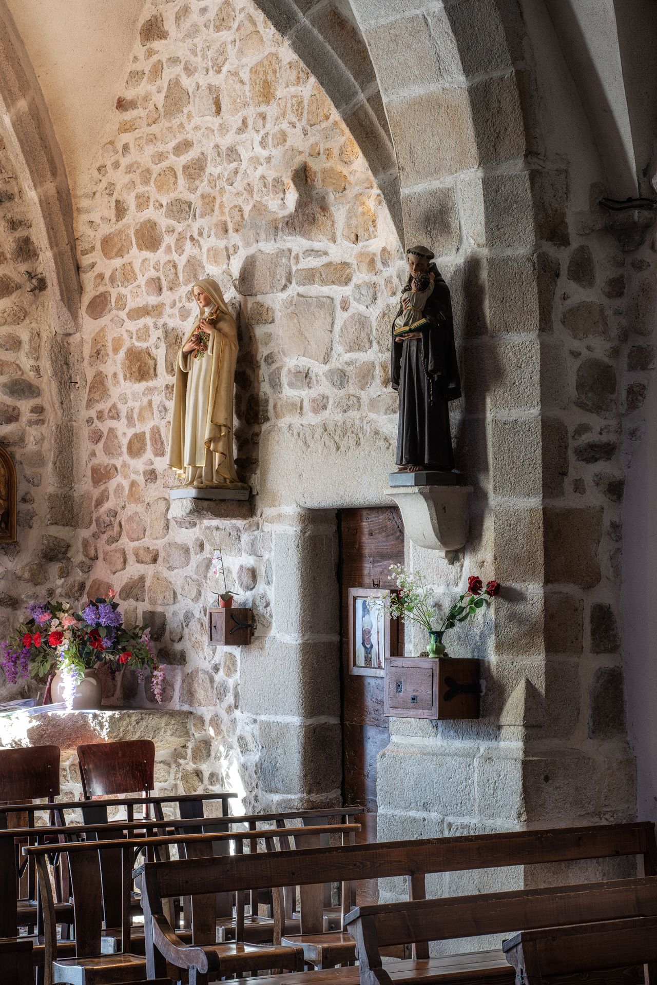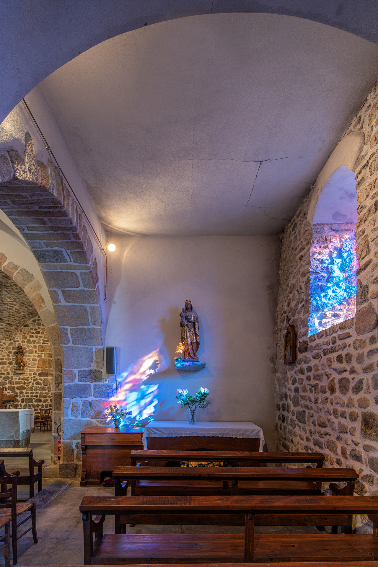 À l’intérieur, les aménagements des années 60 ont enlevé partout les enduits et mis la pierre à nu ; seules méritaient de l’être les pierres de taille des arcades : l’arc triomphal et les deux arcs des chapelles de la première travée.