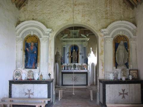L’intérieur est couvert d’un lambris sur entraits moulurés. Trois retables, en calcaire très blanc, ont été placés au XVIIIe s. dans l’église, au moment de la réunion des reliques des saints. Le retable de l’autel majeur, de composition très classique, est surmonté d’un fronton brisé, il est orné en son centre d’une niche entre deux colonnes de couleur noire, imitant le marbre. Deux portes latérales donnent accès à une petite sacristie, derrière l’autel. Sur le mur qui sépare la nef du sanctuaire ont été adossés, de part et d’autre du passage, deux autels latéraux avec niches et frontons courbes. Des croix de Malte figurent sur les antependia des autels. Dans la niche du maître-autel a été placée la statue de saint Ménelé, qui aurait débarrassé la paroisse de la prolifération excessive des lapins.