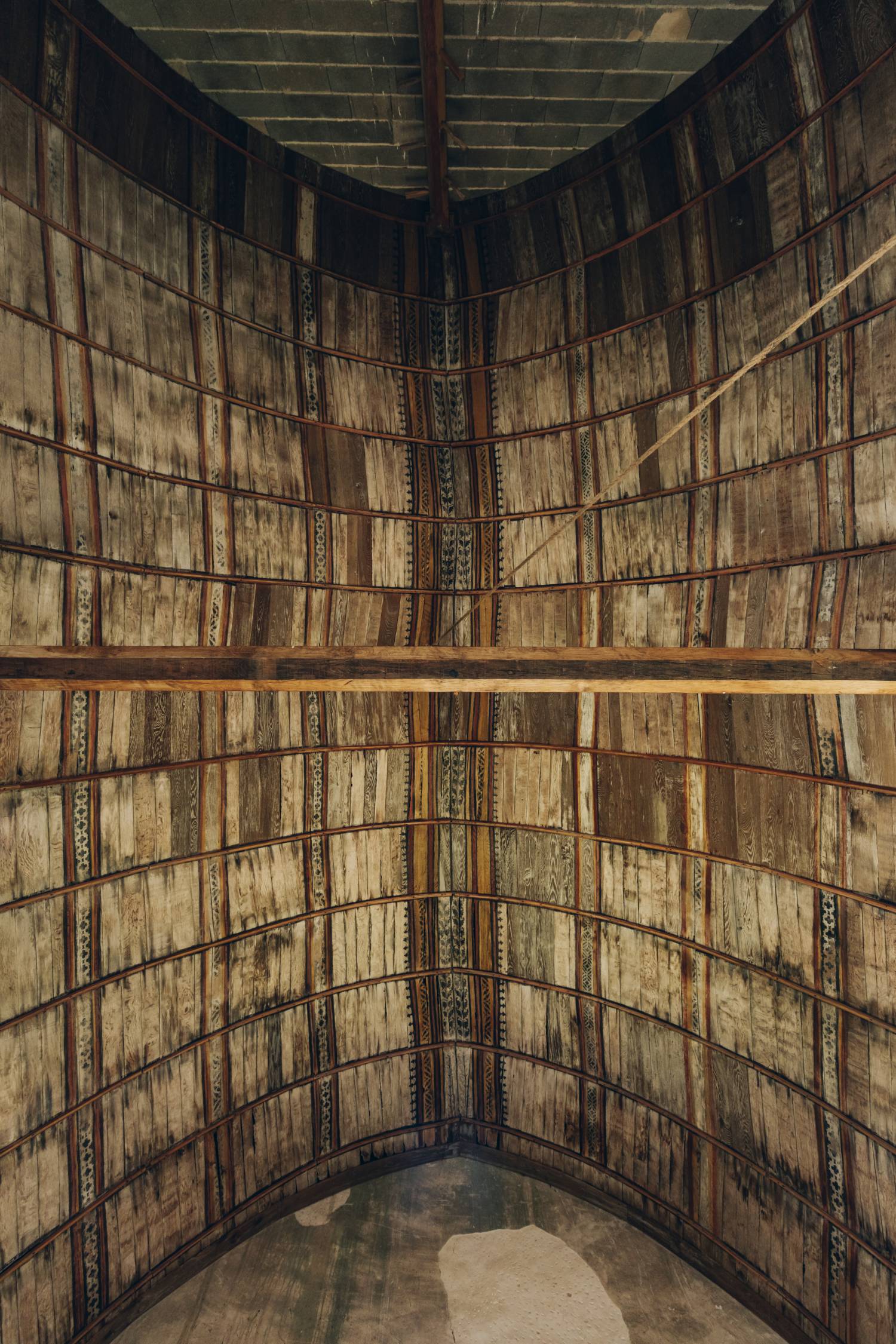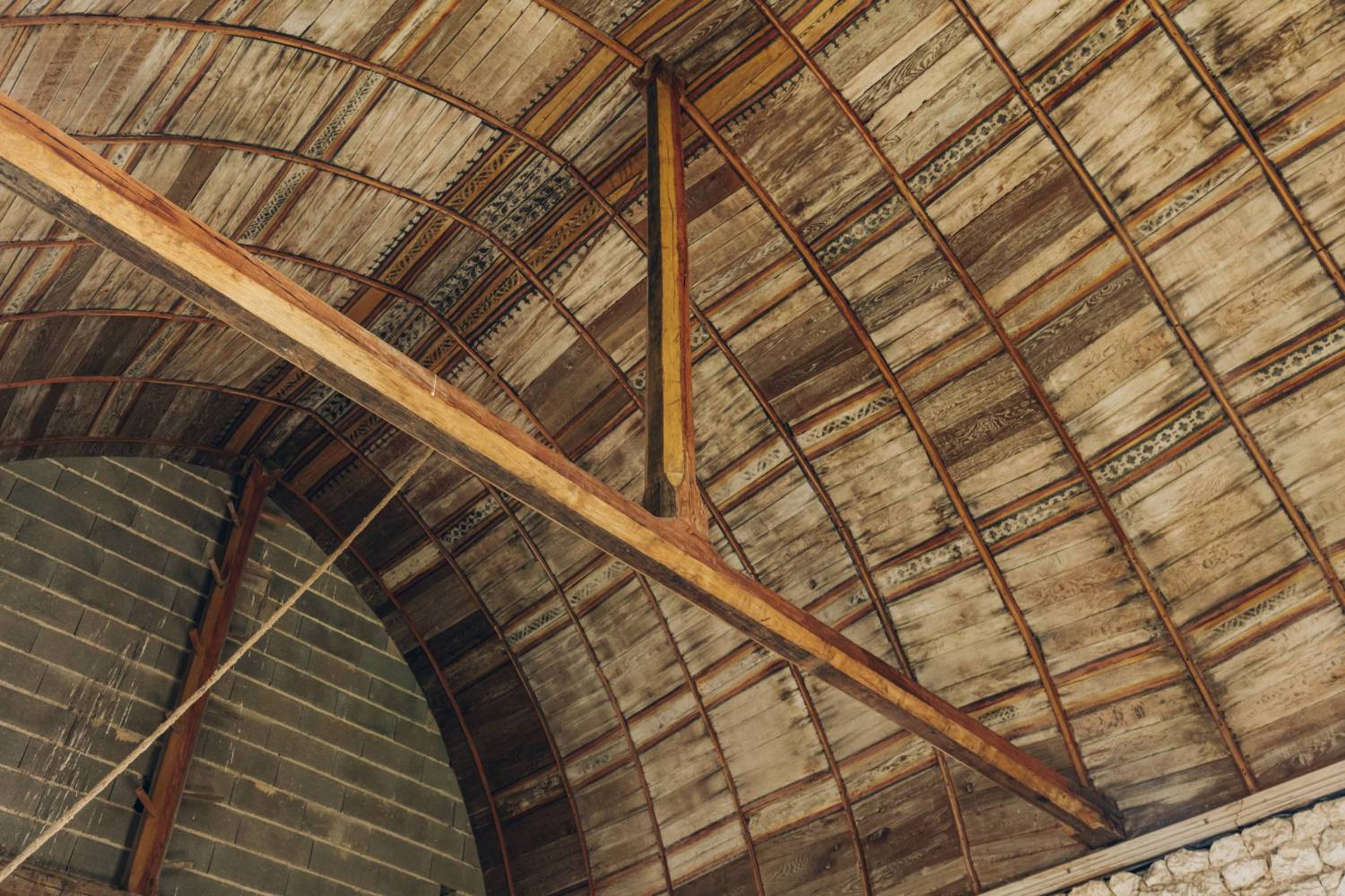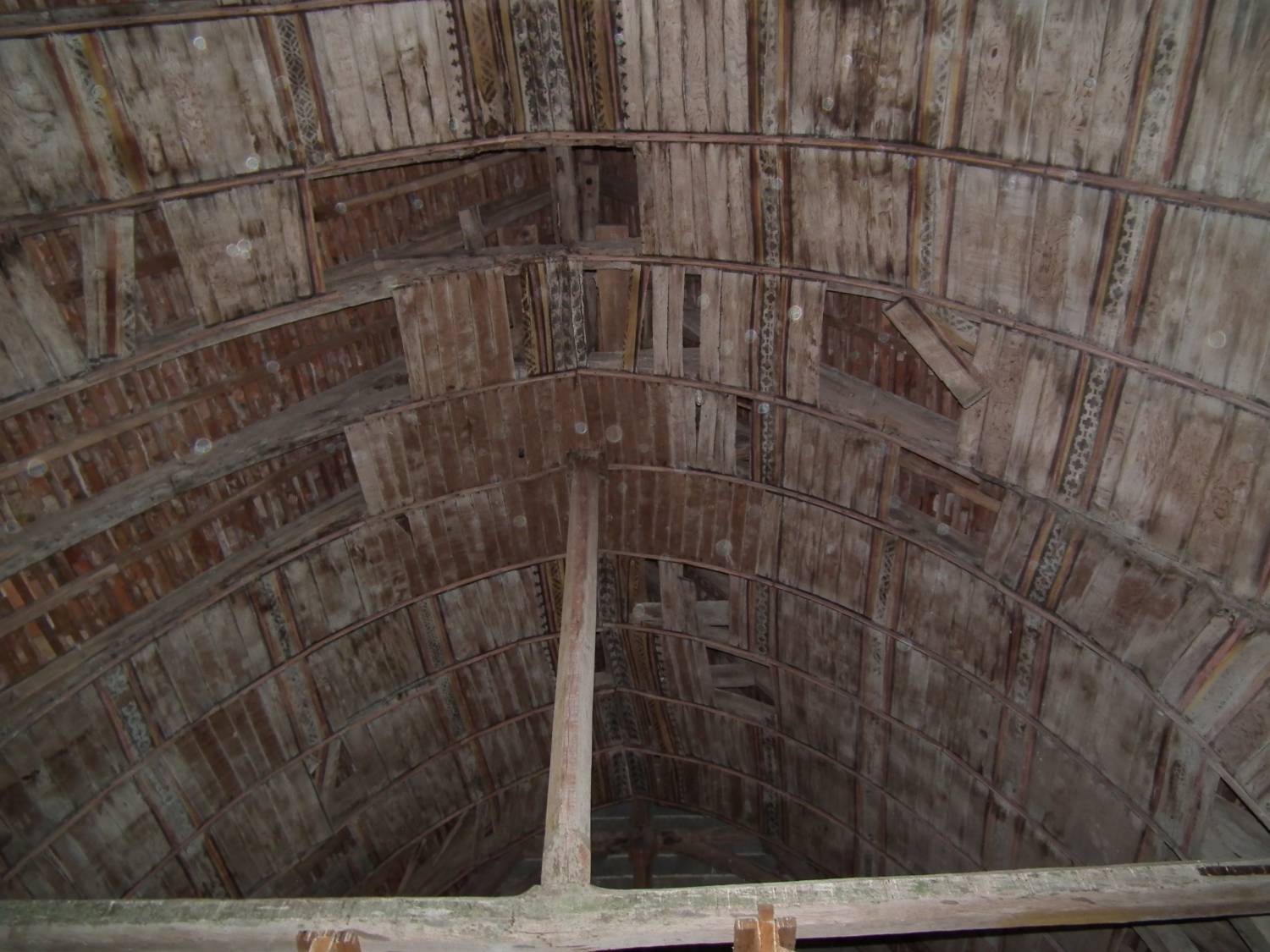 L’intérieur de l’édifice est couvert d’une voûte en berceau lambrissé, restaurée en 1849 par l’architecte diocésain Gustave Guérin. Les planches, maintenues par des couvre-joints, portent un décor ornemental de bandes peintes délimitées par des filets. D’inspiration végétale ou géométrique, les motifs qui les garnissent ont été exécutés au pochoir. La peinture, à la détrempe, met en œuvre des pigments en nombre limité : ocre jaune, ocre rouge, noir de fumée et blanc de chaux. Ces caractéristiques techniques s’observent également dans les peintures qui recouvrent en partie les murs nord, est et sud, qui font tout l’intérêt de la chapelle.