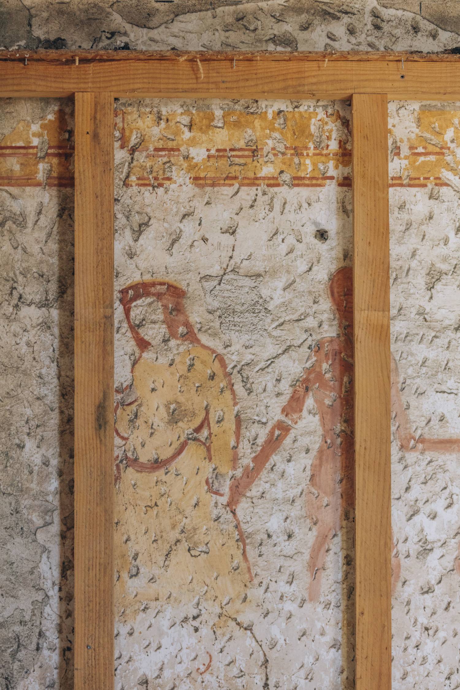 Or, la peinture de Preuilly, qui reproduit, sur le mur du chevet, l’orchestre connu par la gravure de 1486, offre la particularité, peu courante, de comporter à la fois une danse d’hommes (mur nord) et une danse de femmes (chevet, mur sud). Son exécution doit donc se placer à l’extrême fin du XVe s. ou, plus probablement, au siècle suivant. Elle s’organise en panneaux comprenant deux ou quatre personnages, selon le principe précédemment exposé. Un badigeon blanc recouvre uniformément les fonds. Les dix-huit scènes conservées incorporent les vers mentionnés plus haut, rédigés en écriture gothique. Elles sont encadrées par des bandes jaunes soulignées de filets rouges et rehaussées, par endroits, d’un motif décoratif végétal de couleur noire, aussi présent sur la voûte lambrissée.