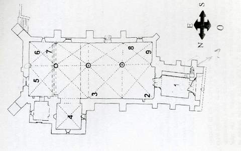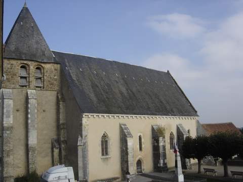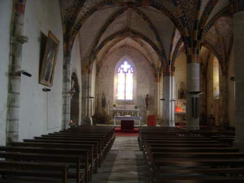 Le clocher-porche, de la fin du XIIe s., dresse son élévation massive dont l’effet est accentué par l’absence d’ouvertures, à l’exception des baies géminées du beffroi, et par le rythme des puissants contreforts qui épaulent ses trois faces ; ceux de la façade occidentale encadrent un portail au profil brisé à voussures et colonnettes dont les chapiteaux sont décorés de motifs de masques ou de gros boutons limousins. Sous la travée de clocher, un deuxième portail, en plein cintre, donne accès à la nef, voûtée sur croisées d’ogives dont les nervures viennent mourir du côté des grandes arcades dans des colonnes sans chapiteau et du côté des murs gouttereaux dans des colonnes engagées. Un élégant décor polychromique rend particulièrement esthétique cette file de voûtes : tandis que les nervures sont soulignées de bandes alternées de couleurs, les voûtains ont reçu un décor de faux appareil ou de motifs végétaux proposant un florilège très varié de feuillages légers et de rinceaux, des bandes géométriques aux dessins renouvelés simulant la séparation des voûtains. Les tonalités ocre, rouge et indigo contribuent au rendu gracieux de ce décor soigné dont une étude stratigraphique permettra de préciser la datation et de confirmer l’hypothèse selon laquelle sa réalisation au XIXe s. a peut-être repris des éléments antérieurs du XVIe siècle.
