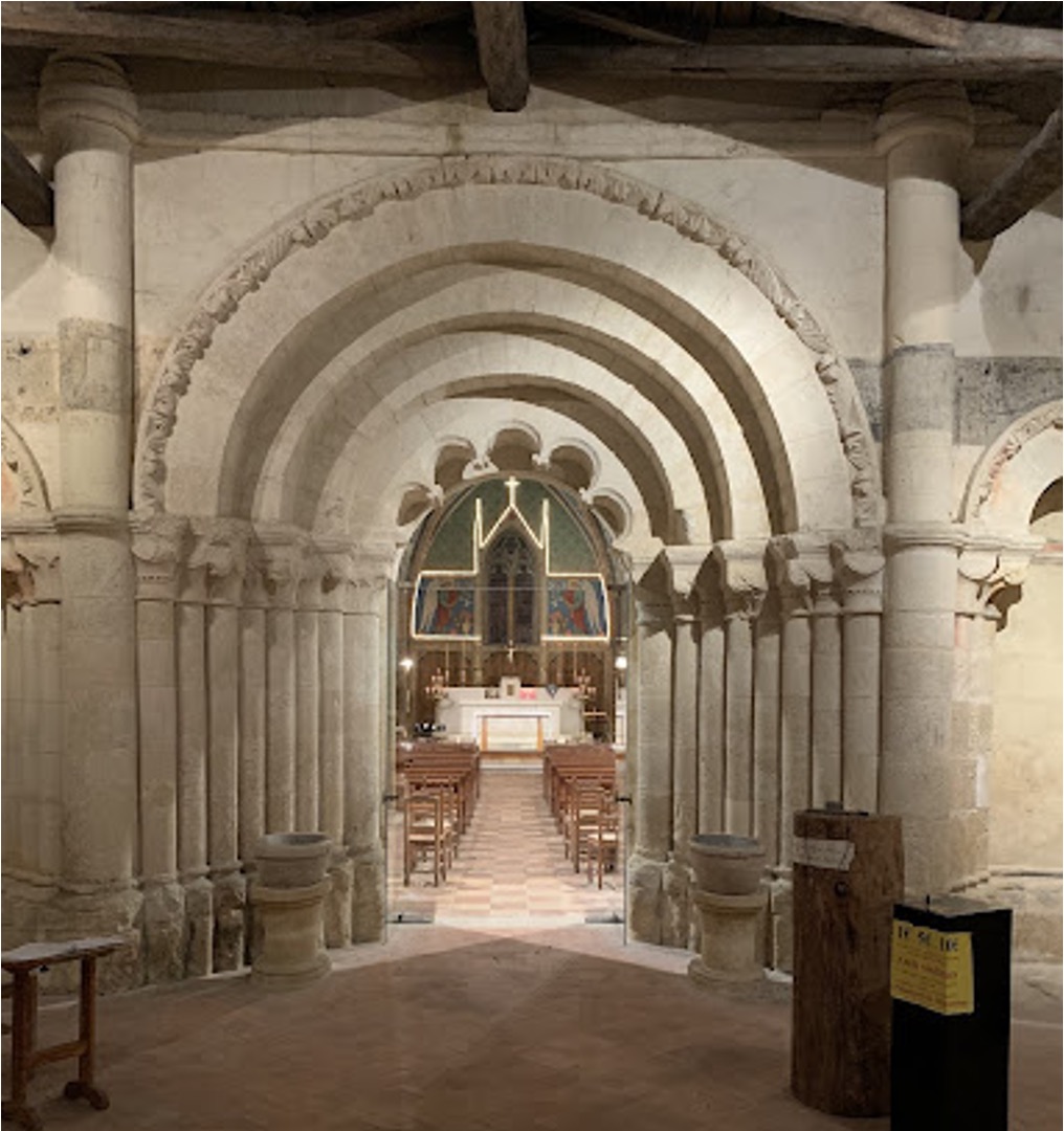 Le portail roman, classé Monument historique le 22 septembre 1914, constitue l’un des éléments les plus remarquables de l’église. Encadré de deux fausses portes, il présente une porte centrale à redents, des chapiteaux jumelés et des tailloirs sculptés. Ce portail est aujourd’hui protégé par un porche moderne, vestige restauré entre 1989 et 1991 afin de préserver les sculptures et peintures médiévales mises en valeur par la restitution partielle de leur polychromie. Ce porche, autrefois lieu d’assemblée et de marché, illustre le rôle social majeur de l’édifice dans la vie du village.