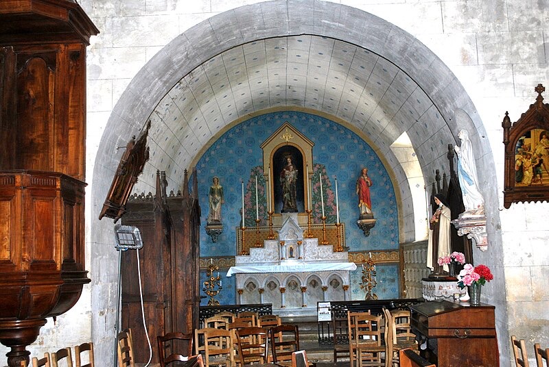De la construction romane primitive subsistent la partie basse de la façade, un portail polylobé et les deux premières travées de la nef, dont les murs ont été surélevés et les baies remaniées. Une unique baie romane subsiste encore au nord. Le chœur gothique, élevé à la fin du XIIIe siècle, est voûté d’ogives retombant sur des chapiteaux sculptés de feuilles de vigne. Il est prolongé au XVe siècle par un sanctuaire voûté d’arêtes, clos par un chevet plat percé d’une baie à meneau.