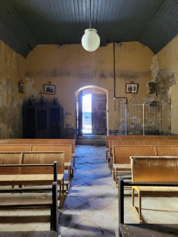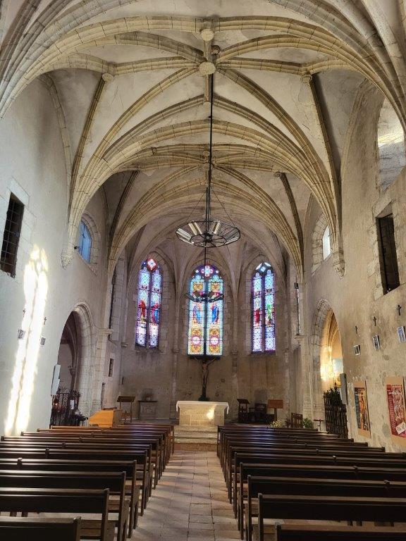 L’église se compose d’une nef prolongée à l’est par une abside polygonale. Les quatre travées de la nef ainsi que l’abside sont voûtées sur croisées d’ogives, agrémentées de liernes et de tiercerons. Deux chapelles latérales s’ouvrent sur la dernière travée, enrichissant la structure de l’édifice. La sacristie, située à proximité, présente une voûte en plein cintre en brique.