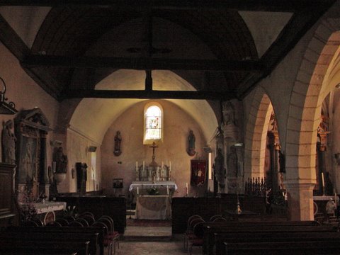 À l’intérieur, nef et chœur sont couverts de voûtes de bois et de plâtre. Le bas-côté sud présente trois arcades en tiers-point reposant sur des piliers octogonaux qui font communiquer les chapelles avec la nef. Les trois voûtes sur double croisée d’ogives en pierre calcaire sont exceptionnelles : elles sont ornées de clés pendantes et d’un médaillon de style Renaissance.