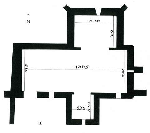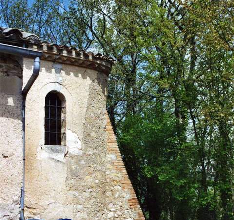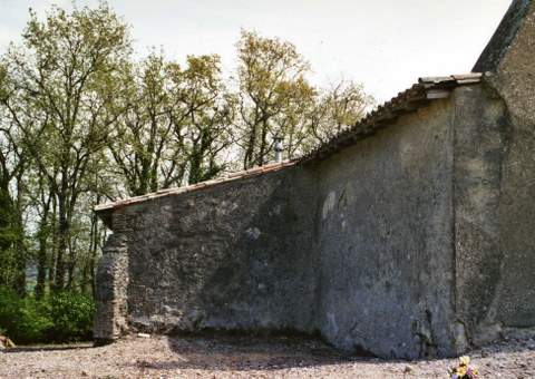 Le versant sud de la toiture couvre à droite une des chapelles latérales, probablement ouverte au XVIe s. (grand arc). Faisant auvent, il constitue à gauche le porche par lequel on accède au bas de la nef. Un simple poteau soutient au milieu la panne inférieure de l’auvent. L’encadrement de la porte est de grès, en plein cintre, mais de tradition gothique (jambages et claveau central). Il semble du XVIe siècle. Le claveau supérieur est sculpté d’un quadrilobe entourant un écu bandé de quatre pièces, avec une fine bordure. Le claveau a été raccourci à droite, ce qui suggère un réemploi. Si l’on fait abstraction de la bordure, le blason pourrait être, selon l’Armorial du Tarn de Charles Portal, illustré par Pierre Mazars (éd. Vielmur, 2004), celui d’un Pezet, de Montans, d’un Monestié, de Rabastens, ou d’un de Cahours, de Cadalen. Montans et Cadalen sont à une dizaine de kilomètres à vol d’oiseau, Rabastens à une quinzaine. Les deux vantaux cloutés sont anciens. Toujours sous le porche, réemployée comme simple pierre à bâtir dans le mur ouest qui prolonge le clocher-mur, se trouve une clef de voûte en calcaire blanc, portant la date, repassée en noir, de 1554. Le croisement des ogives indique qu’elle provient d’une voûte rectangulaire, assurément celle de la chapelle nord, aujourd’hui couverte de charpente. Cette chapelle, à laquelle on accède depuis la nef par un arc gothique sur jambages arrondis, était sans doute une chapelle seigneuriale ; on voit le départ des ogives, mais aussi le profil de la voûte sur les parois, l’enduit mural ayant malheureusement disparu. Un fragment oublié sur le mur intérieur sud de la chapelle, au-dessus d’une niche rectangulaire murée qui pourrait être un enfeu, porte quelques mots d’une inscription au charbon qui paraît relativement ancienne. On croit lire : PETRUS… DIEM. Les ogives, d’un grès très friable appelé dans le pays arena, ont dû s’effondrer avec la voûte. Cet effondrement est antérieur à 1761. En effet, cette date a été gravée en graffiti sur une pierre du mur ouest du porche, donc après l’intégration de la clef de voûte dans celui-ci. Retenons donc à titre d’hypothèse que la chapelle seigneuriale, la clef de voûte (1554) et les armoiries de la porte (à identifier) pourraient être contemporaines.