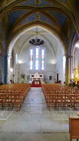 Le décor peint, entrepris avant 1853 et achevé par un élève des frères Pedoya, Henri Petit (1830-1906), de Verfeil en Tarn-et-Garonne, était constitué, sur les voûtes, d’arabesques, candélabres et rinceaux sur fond bleu azur dans un style néo-Renaissance et complété sur les murs de motifs au pochoir, avant sa réduction au XXxe s. et l’exécution de reprises dans la nef. Les vitraux du XIX e siècle des ateliers toulousains de Victor Gesta sont conservés, ainsi que le mobilier liturgique de la seconde moitié du siècle : maître-autel avec ciborium et pinacle surmonté de la croix, en pierre d’Arles, sculpté par Paul Espinasse, d’Albi, autels et statues des chapelles, œuvres des ateliers Virebent, de Toulouse. Des pièces anciennes (un encensoir de la fin du XVIIe s. ou du début du XVIIIe, deux plats de quête du XVIe s. ornés l’un d’une figure de saint Georges terrassant le dragon, l’autre d’une Vierge à l’Enfant, un calice et patène d’argent du XVIIIe s.) constituent une sorte de petit trésor regroupé autour du coffret-reliquaire du Saint-Voile, objet composite remonté après la confiscation et la fonte du reliquaire d’origine pendant la Révolution : le coffret de bois recouvert d’argent et de nacre, aux armes de la famille des Prés et d’une autre famille non identifiée, est surmonté d’une croix d’argent portant le poinçon de la curie pontificale sous Clément VI (1342-1352), dans laquelle il faut sans doute reconnaître celle qui fut léguée au chapitre collégial de Montpezat-de-Quercy par le cardinal Pierre des Prés (1280-1361), vice-chancelier, sous quatre papes d’Avignon. Le tableau de L’Apparition du Christ ressuscité à saint Dominique date du XVIIe s. ; celui représentant sainte Marguerite, œuvre d’Oscar Varcollier (1820-1846), d’après Raphaël et Giulio Romano (musée du Louvre, inv. 607), résulte d’une commande de l’État en 1843.