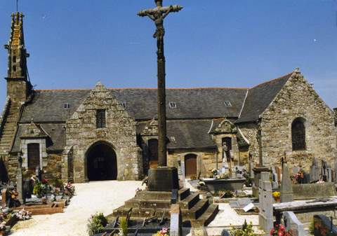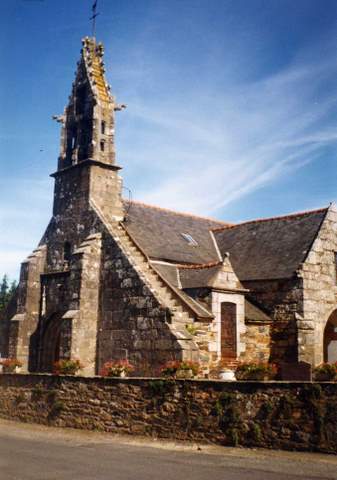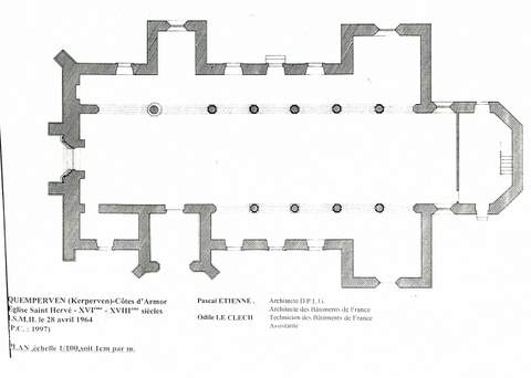 Église de Quemperven est dédiée à saint Hervé ; cet abbé de Saint-Pol-de-Léon, qui vécut au VIe s., aurait en effet, selon une source du XVIIe s., fondé un monastère sur le territoire de la commune à laquelle il aurait donné son nom (Quemperven provenant, selon les interprétations, soit de « campus Hervei« , « territoire d’Hervé » en latin, soit de « kemper gwenn« , « confluent blanc » en Breton). L’église, citée dans les bénéfices du diocèse de Tréguier dès 1330 et érigée en paroisse en 1426, a été entièrement reconstruite au XVIe s. ; elle était alors vraisemblablement de plan rectangulaire, comprenant une nef flanquée de deux bas-côtés et fermée à l’ouest par un clochermur, un chœur à chevet plat ; une chapelle seigneuriale ouvre sur le bas-côté nord. Une importante campagne de travaux, échelonnée sur tout le XVIIIe s., a profondément modifié la silhouette de l’édifice : construction du porche sud, surmonté de la secrétairerie, en 1712 ; construction de deux chapelles formant un faux transept, en 1731 au nord et 1732 au sud ; construction de la première sacristie au sud du chœur en 1740, démolie en 1770; construction (ou réaménagement dans l’ancien chœur) de la sacristie actuelle en 1761 ; reconstruction des bas-côtés de 1781 à 1784, ce qui a provoqué une modification de la pente du toit. Parallèlement à ces agrandissements successifs, l’église s’orne d’un riche mobilier : le retable central est commandé en 1716 au sculpteur Yves Corlay, et les chapelles nord et sud sont dotées de retables, respectivement en 1759 et 1772. L’église présente actuellement un plan en croix latine, avec une nef à sept travées ; un bas-côté sud dont les deux premières travées (à l’ouest) sont occupées par la chapelle des fonts et par le porche sud, qui empiète curieusement sur l’édifice ; un bas-côté nord sur lequel ouvre la chapelle Saint-Jean, face au porche sud; à l’extrémité est, les bas-côtés ouvrent directement sur les deux chapelles formant faux-transept ; le chœur, très peu profond, à pans coupés, est clos à l’est par une cloison le séparant de la sacristie. Fruit de ces remaniements successifs, l’église offre une silhouette composite, essentiellement marquée par le XVIIIe s., rythmée par les volumes du porche sud et des chapelles, et par les découpes originales des lucarnes à fronton ; les maçonneries aux appareils très divers attestent les nombreuses reprises. Seule la façade occidentale subsiste, intacte, de la première campagne de construction. Elle est caractéristique d’une formule architecturale commune à de nombreuses petites églises des XIVe, XVe et XVIe s. en Basse-Bretagne : sa découpe triangulaire, unifiant la nef et les bas-côtés, est surmontée par un clocher-mur à trois baies sur deux niveaux, couvert en bâtière de dalles de pierre ornées de crochets. Cette façade très sobre est percée d’un portail, flanqué de deux contreforts qui contrebutent la nef, dont l’ornementation finement sculptée est bien représentative de celle des églises bretonnes du XVIe s. : le portail en arc à peine brisé est inscrit dans une embrasure à ressauts et à colonnettes engagées que couronne un gâble en accolade ; il est orné de choux frisés et surmonté d’un fleuron central et de deux pinacles latéraux.Pour la reprise des maçonneries et le rejointoiement de l’ensemble de l’édifice, la Sauvegarde de l’Art français a versé une subvention de 80 000 F en 1998.