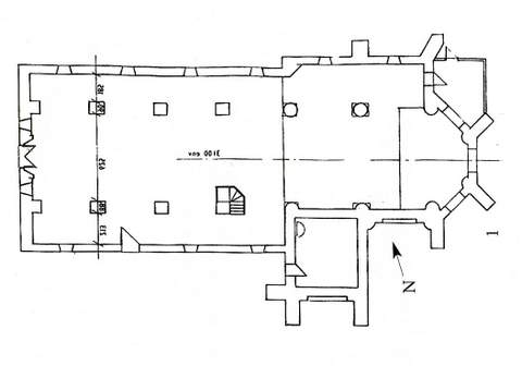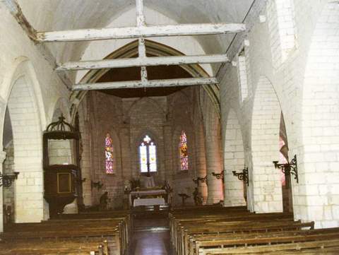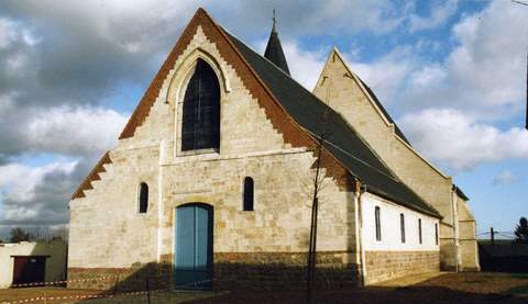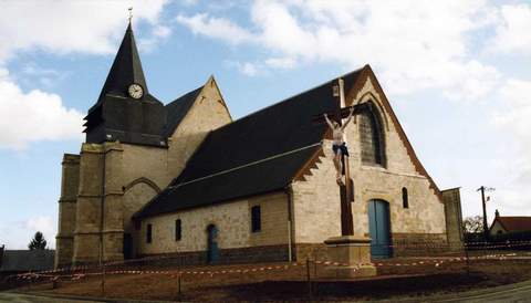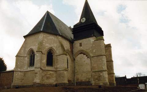 Église Saint-Gervais-Saint-Protais. La cure de Querrieu était à la présentation du chapitre de Saint-Firmin-leConfesseur d’Amiens. Bernard, sire de Querrieu, avait vendu au chapitre de la cathédrale d’Amiens un tiers de la dîme, après en avoir donné un autre tiers à l’hôtel-Dieu de la même ville vers 1230. Le chapitre de Saint-Firmin-le-Confesseur et le curé du lieu se partageaient le reste. Comme bien des églises de Picardie, celle de Querrieu offre une silhouette déséquilibrée. Le chœur du XVe s. domine nettement la nef modeste, plus tardive comme en témoignent les proportions réduites du collatéral nord, ce qui obligea à aveugler en grande partie l’ample arcade percée dans le mur ouest du clocher en prévision d’une construction beaucoup plus ambitieuse. Les matériaux diffèrent légèrement d’une partie de l’édifice à l’autre. Si des blocs de grès forment partout l’infrastructure pour éviter les remontées d’humidité, la qualité du calcaire des parties supérieures paraît meilleure dans le chœur que dans la nef où s’ajoutent des compléments en brique notamment sur les ram pants du pignon occidental. Le mur-pignon de la façade est percé d’un portail moderne sous une grande baie en arc brisé, privée de son remplage, sous une archivolte saillante. Les trois vaisseaux de la nef, longs de quatre travées, « sont séparés par des piliers quadrangulaires. Le vaisseau central sans éclairage direct est couvert d’un lambris sur entraits et poinçons. Les écoinçons des grandes arcades semblent conserver du côté sud la trace de fenêtres hautes. Les grandes arcades du mur nord du vaisseau central sont plus soignées avec un cordon mouluré doublant l’extrados des arcs brisés. Les parties orientales plus monumentales comprennent un chœur de deux travées et une abside à trois pans. Le chœur est flanqué d’un bas-côté unique au sud. Un puissant clocher borde la première travée au nord. Mais les arcades bouchées sur le côté oriental du clocher et le flanc nord de la deuxième travée du chœur indiquent qu’un vaisseau latéral nord était prévu en symétrique du collatéral sud. Le chœur est couvert d’un plafond lambrissé moderne qui avait remplacé un autre, postérieur à 1764, puisqu’à cette date le voûtement d’ogives initial avait disparu. Du couvrement d’origine sont conservés les formerets engagés dans le mur au sommet des piliers de tracé courbe qui séparent les pans de l’abside ou les deux travées de la partie droite. Les baies d’assez faibles dimensions sont vigoureusement moulurées sur les piédroits et les arcs de couvrement. Le remplage de la baie axiale à deux lancettes trilobées sous un soufflet paraît d’origine ; les festons qui ornent l’intrados des arcs des baies latérales semblent le fruit de remaniements ultérieurs. L’abside est puissamment articulée à l’extérieur par des contreforts très saillants rythmés par deux larmiers dont celui du haut se poursuit sur les maçonneries intermédiaires et contourne les baies du chevet. Le sommet taluté des contreforts accuse une forte pente. La structure massive du clocher devait être percée sur trois côtés initialement. Un beffroi de charpente couvert d’ardoises coiffe les parties maçonnées qui auraient dû recevoir plus d’ampleur. En 1999, la Sauvegarde de l’Art français a accordé une subvention de 100 000 F pour d’importants travaux de consolidation des maçonneries, le ravalement extérieur et des aménagements intérieurs.