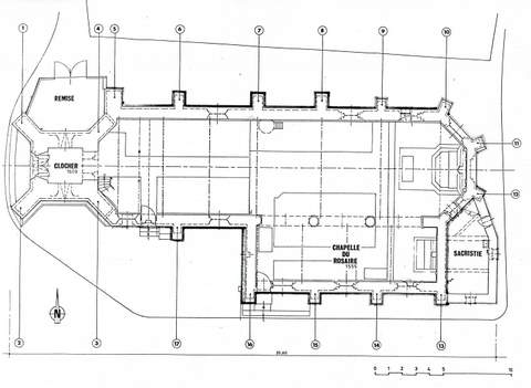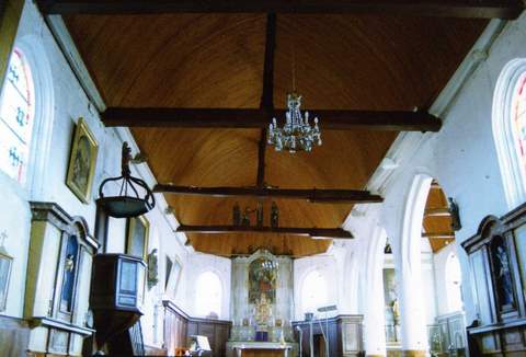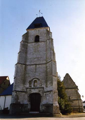 L’église Saint-Michel. L’église de Quesnoy est construite en craie au-dessus d’un soubassement de grès ou de silex, voire de brique selon les endroits. De caractère austère, pourvu de contreforts d’angle disposés obliquement, le haut clocher-porche a été achevé en 1609 comme l’indique le chronogramme sur la corniche juste au-dessus du cadran de l’horloge. Sur le même côté sud du clocher avait été peint en 1777 un cadran solaire dont ne restent que des vestiges. L’église comprend une longue nef à vaisseau unique de quatre travées, précédant l’abside polygonale à cinq pans. La construction est épaulée par des contreforts entre lesquels sont percées des baies en arc brisé. Au sud de la moitié orientale de l’église est accolée la chapelle du Rosaire, élevée en 1555. Les deux parties communiquent par de grandes arcades au tracé brisé portant sur des colonnes. Derrière cette chapelle a été élevée entre 1714 et 1738 une sacristie. La nef de l’église ainsi que la chapelle du Rosaire sont couvertes de deux charpentes lambrissées refaites il y a une vingtaine d’années.