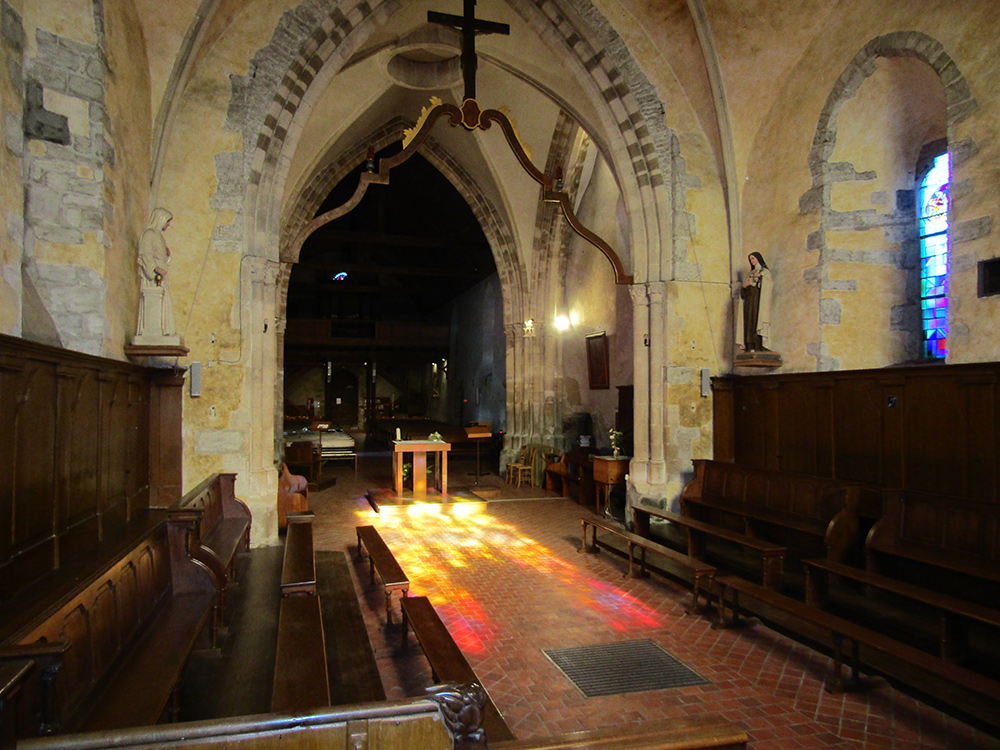 La nef est voûté en berceau lambrissé et le choeur en ogives de pierre.