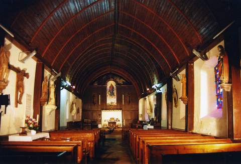 À l’intérieur, l’église est voûtée d’une charpente lambrissée à profil brisé dont les entraits ont été coupés, fragilisant ainsi la structure et provoquant un dévers des murs gouttereaux côté sud. L’église conserve un bel ensemble mobilier dont nombre d’éléments remontent au XIXe s., à l’exception d’une Vierge au croissant en bois doré ( XVIIIe s.), d’une Vierge de Douleurs en bois polychrome du XVIe s., de pierres tombales – celle de l’intérieur date de 1363, tandis qu’à l’extérieur est conservée une tombe de 1722 – . Une cuve baptismale octogonale date du XIIIe siècle.