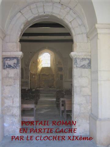 Ce portail, dégagé par la récente restauration, est l’élément le plus remarquable de l’église : un arc, de petits losanges appareillés, repose sur des piédroits coiffés d’impostes ; celle de gauche est ornée d’une torsade, celle de droite d’un motif de palmettes. Au-dessous des impostes ont été placés deux bas-reliefs représentant des animaux, peut-être des lions gardiens du seuil. Ils sont représentés en mouvement, les pattes dressées pour bondir et la queue relevée. Le traitement assez rond et le faible relief évoquent les frises en méplat des abbayes lyonnaises, particulièrement les vestiges de l’Ile-Barbe : ils confirment la datation de la partie romane, sans doute contemporaine de l’édification de la grande abbaye.