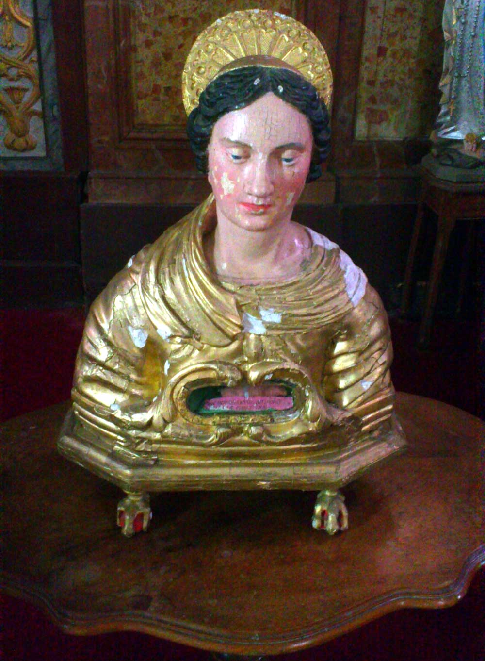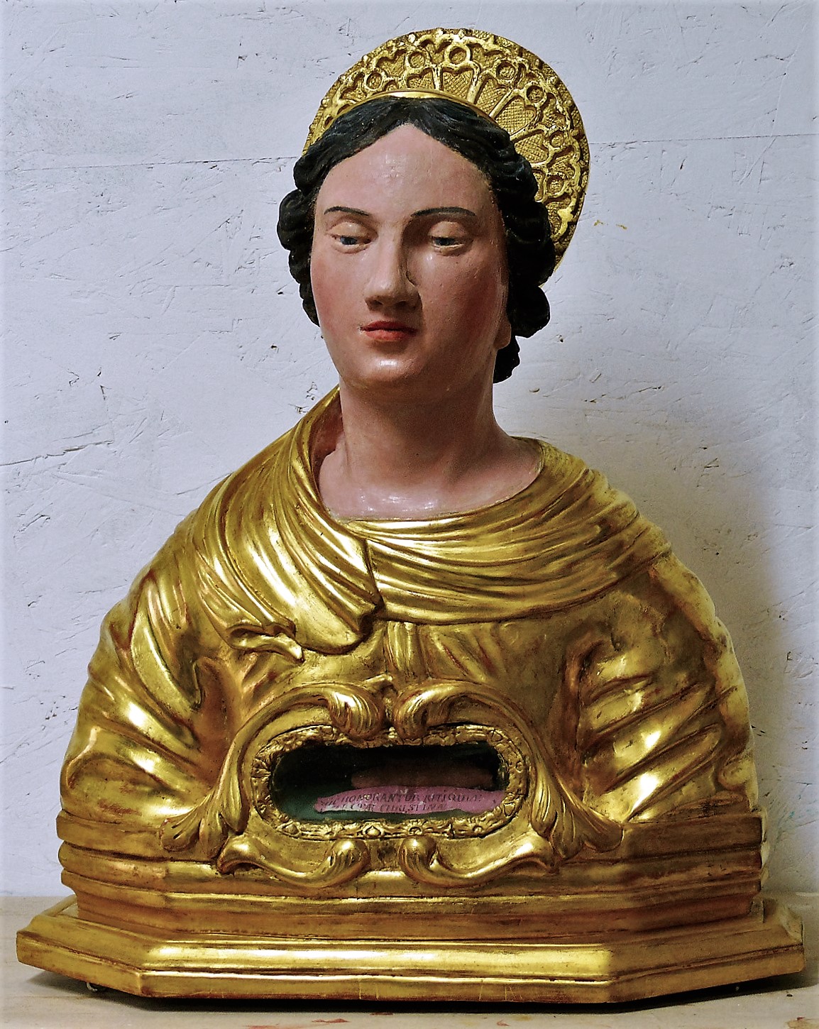 Il présentait un aspect visuel peu satisfaisant dû à des réparations de fortune. Il était donc prévu de nettoyer, de fixer et de mettre à jour la polychromie originelle (la couleur bleue des pupilles dépassant sur la paupière supérieure est le signe de la présence d’une polychromie antérieure). La restauration consistait à : consolider les assemblages (pieds et auréole), de réparer et nettoyer la loge aux reliques et enfin de remettre en place et sécuriser le buste au sein de l’église dans laquelle il n’était plus présenté.