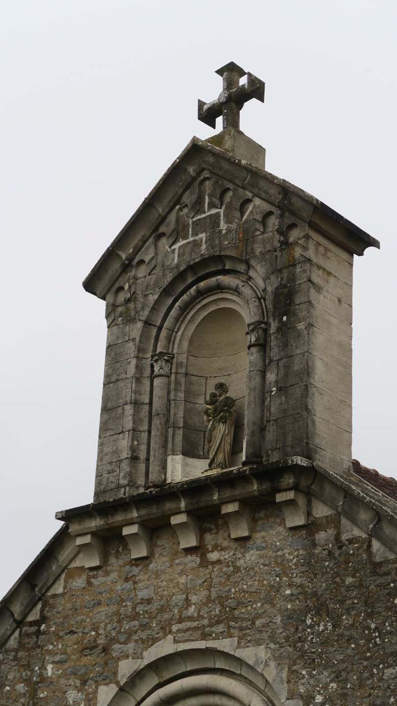 Un clocher carré couronné d’une flèche couverte en ardoises surmonte la croisée de la 5ème travée de la nef.
