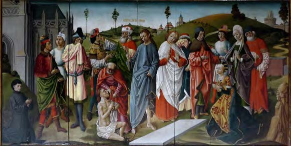 Cet évangile est tiré des écrits de saint Jean. Ce dernier raconte que le cadavre de Lazare sentait déjà très mauvais au moment où le christ lui rendit la vie. Le peintre de cette magnifique œuvre a pris le soin de représenter certains des personnages de la foule se bouchant le nez, tant l’odeur du mort est désagréable.