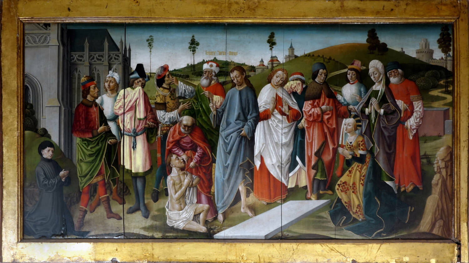 Le Christ, en robe conventionnelle gris-bleutée, entouré de saint Jean et de saint Pierre, ressuscite Lazare devant une foule de spectateurs ; « Lazare Veni Foras » est écrit au-dessus de la tête du Christ en lettres d’or dans le ciel. Cela signifie « Lazare, viens dehors ! ». Lazare était l’un des proches de Jésus. Décédé prématurément, le Christ ressuscita Lazare 4 jours après la mort de ce dernier.
