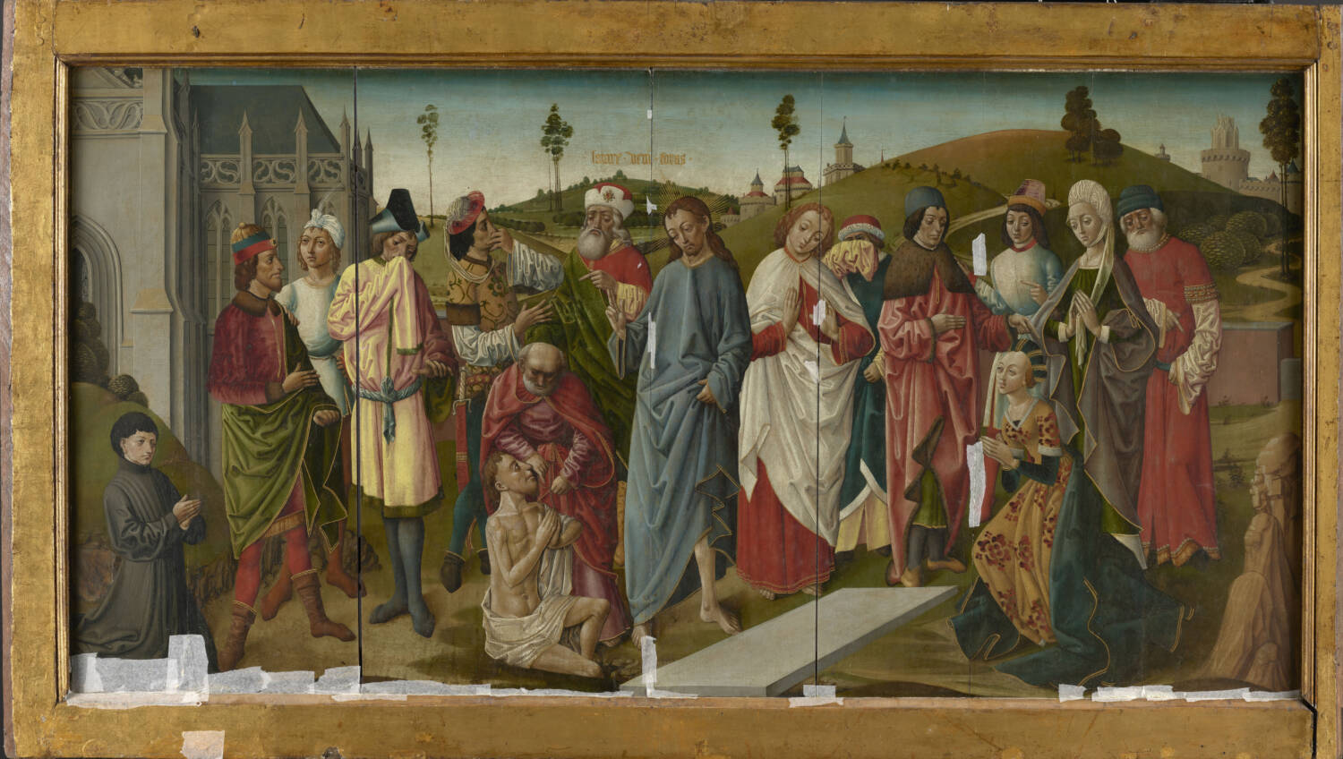Cette œuvre est composée de huit panneaux de bois assemblés avec un cadre doré. Elle souffrait de nombreux désordres : les panneaux étaient fortement disjoints, provoquant des soulèvements de la couche picturale. Les lacunes laissaient apparaître la préparation blanche sous-jacente. Le vernis s’était oxydé ce qui rendait l’image irrégulière et jaunie. La restauration de cette œuvre devenait urgente.