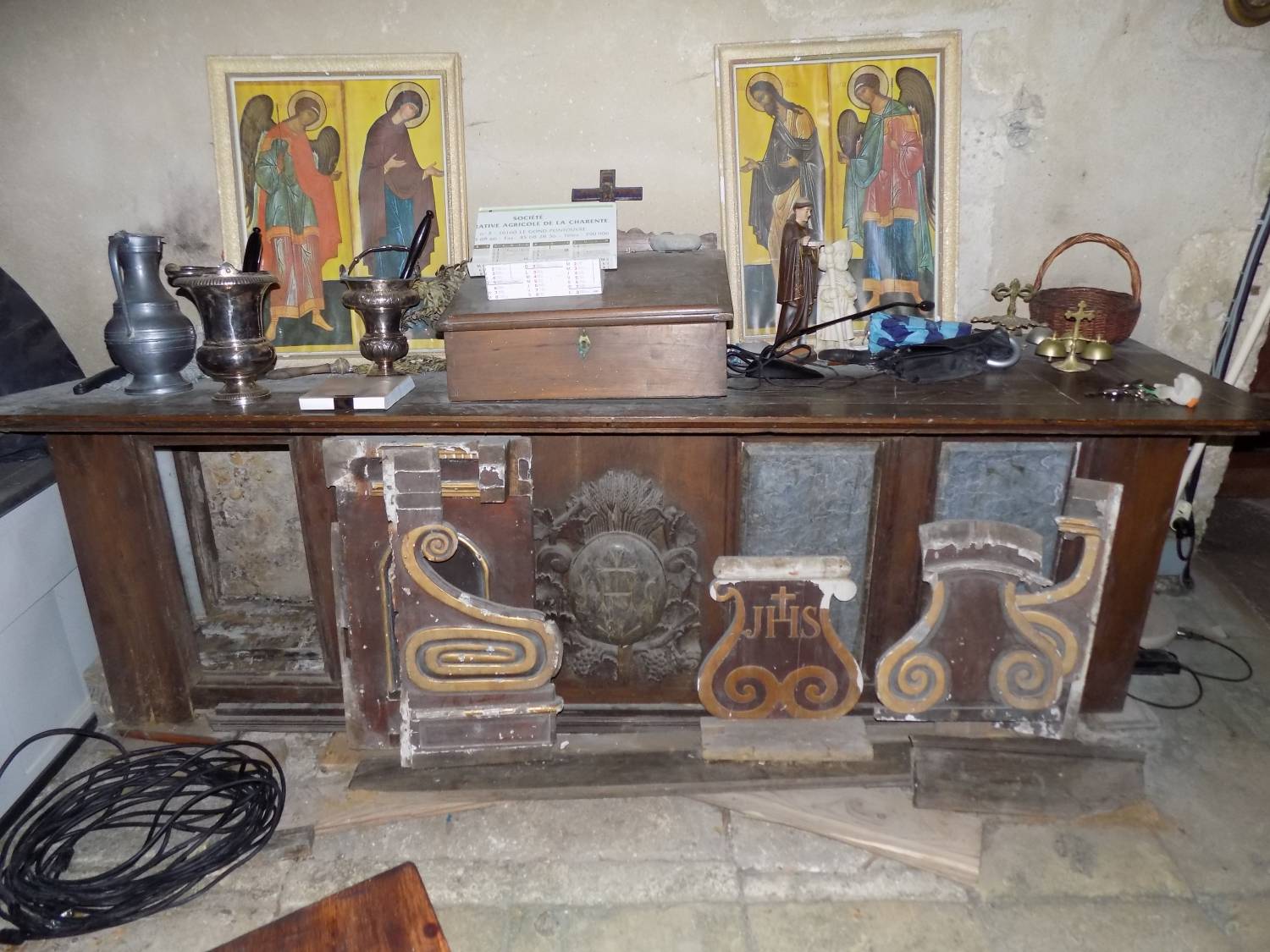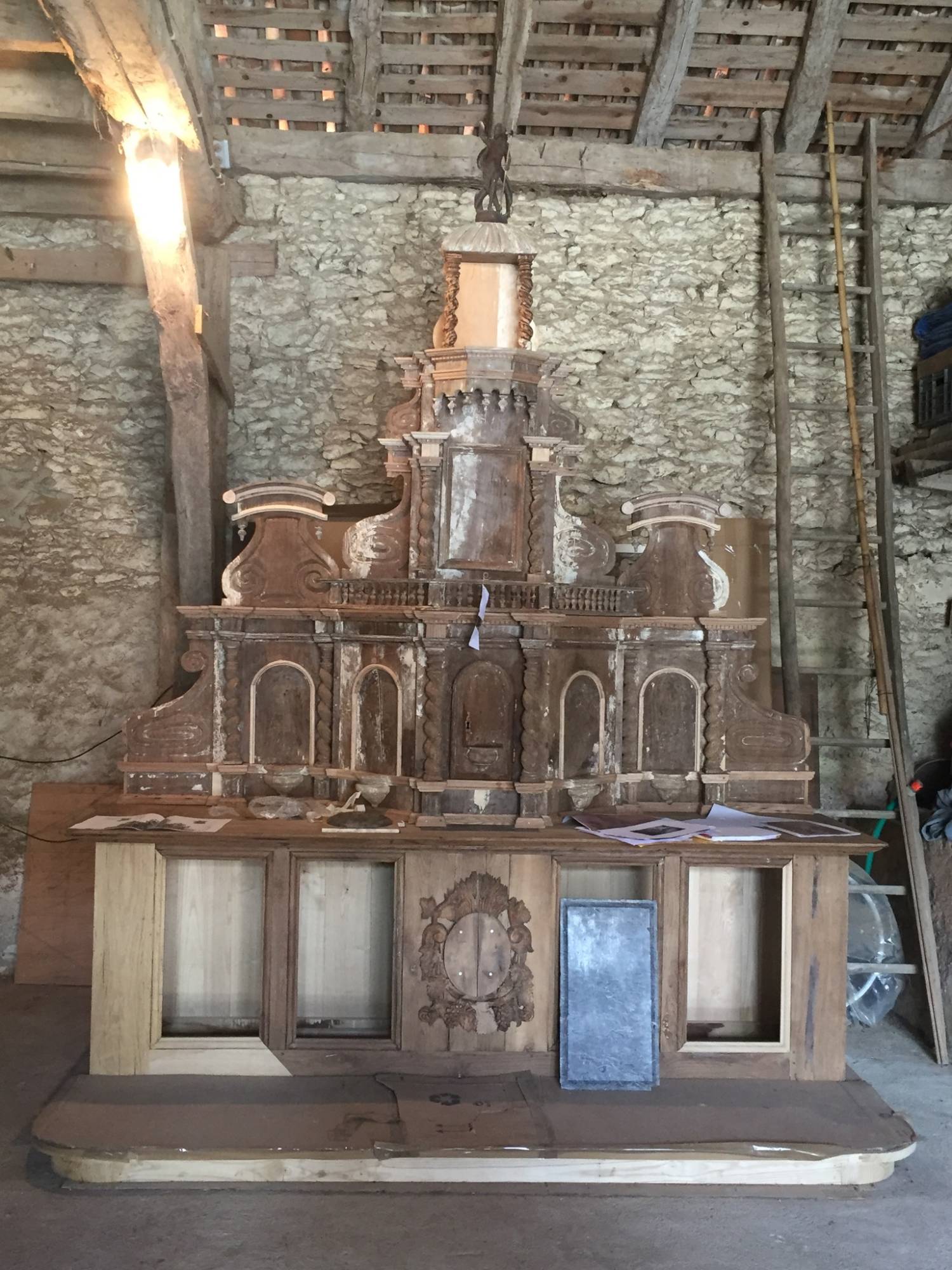 Parmi eux se trouve le retable maître-autel de l’église de Valeuil. Ce bel et imposant objet datant du début du XVIIIème siècle a subi pendant plus de quarante ans l’humidité et les insectes xylophages, les bois se sont ainsi affaissés. De plus, il a été partiellement démonté et des éléments étaient manquants.