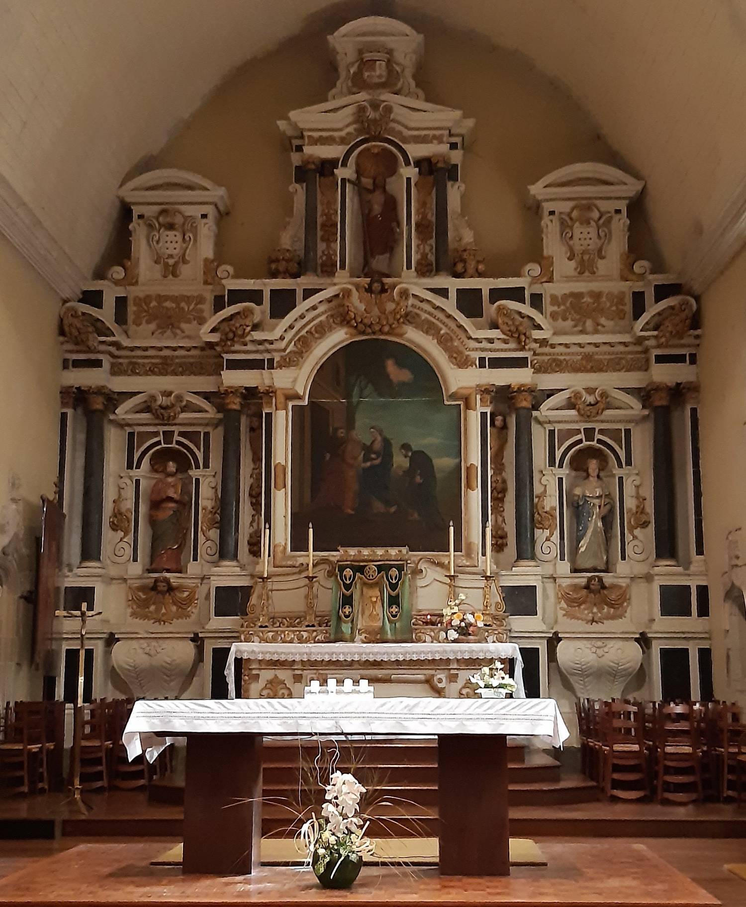 Le grand retable, entièrement sculpté dans le tuffeau, est composé de manière classique : une forte travée centrale reçoit, au-dessus de l’autel et du tabernacle, un tableau encadré de colonnes de marbre noir supportant un entablement cintré, et au niveau supérieur une niche abritant une statue également encadrée de colonnes. Les deux travées latérales sont occupées par une crédence galbée au niveau du soubassement, surmontée d’une niche à statue. L’ensemble est couronné d’attiques à fronton cintré portant des armoiries.