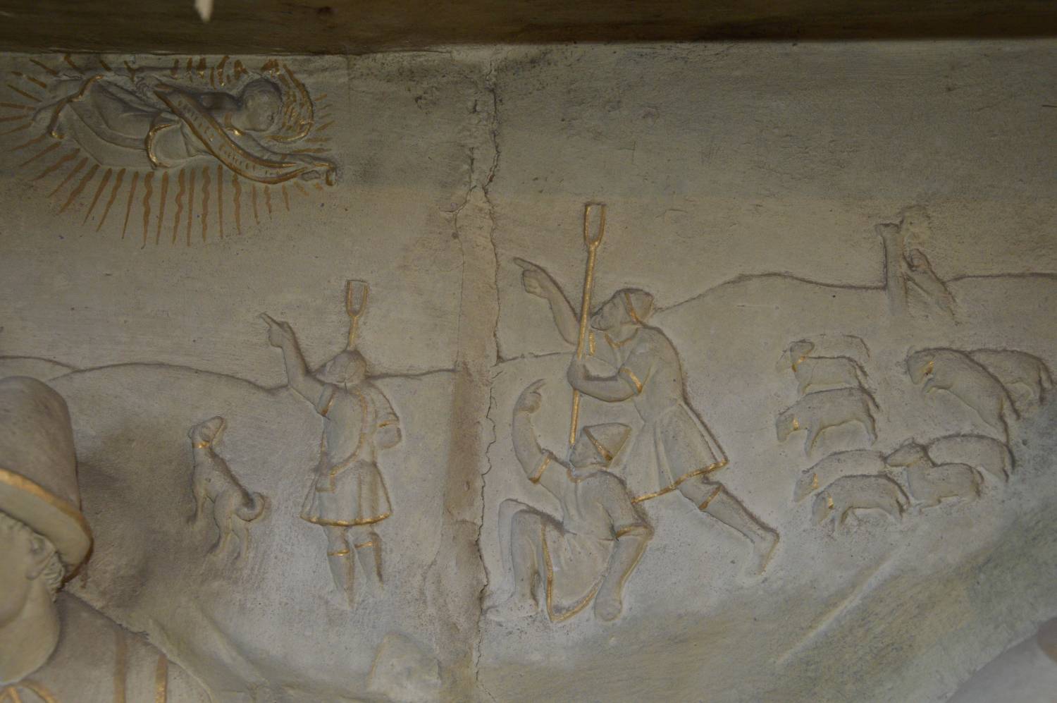 En arrière-plan, les bergers aperçoivent l’ange qui leur annonce la naissance de leur Sauveur, inscrite sur un phylactère. Leur puissance symbolique est grande : ils incarnent le petit peuple, les gens simples à qui Dieu se manifeste avant tous les autres. On est alors étonné par la présence des personnages au premier plan, qui portent de luxueux habits et sont accompagnés, non pas de chiens de bergers, mais de beaux lévriers, symbole d’un statut social prestigieux. Les commanditaires, sûrement les seigneurs de la Renaudière résidant au château voisin, tenaient probablement à se faire représenter sous les traits de ces bergers venus adorer le Christ, en signe d’allégeance renouvelée à la foi catholique.