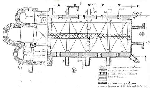 L’église avait acquis son plan définitif, avec une nef de quatre travées, alors seulement couverte d’un plafond en charpente, et un chœur à trois vaisseaux, supportant un clocher carré et terminé par une abside flanquée de deux absidioles.