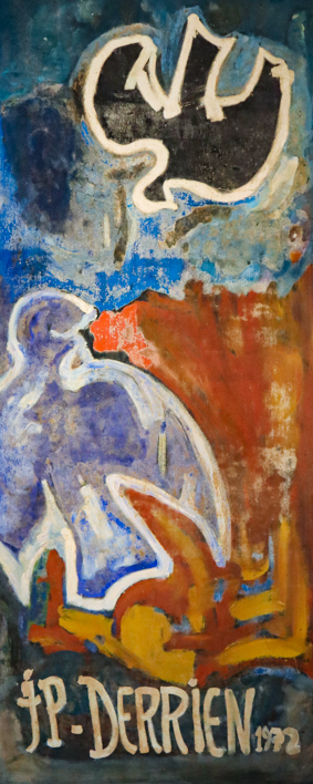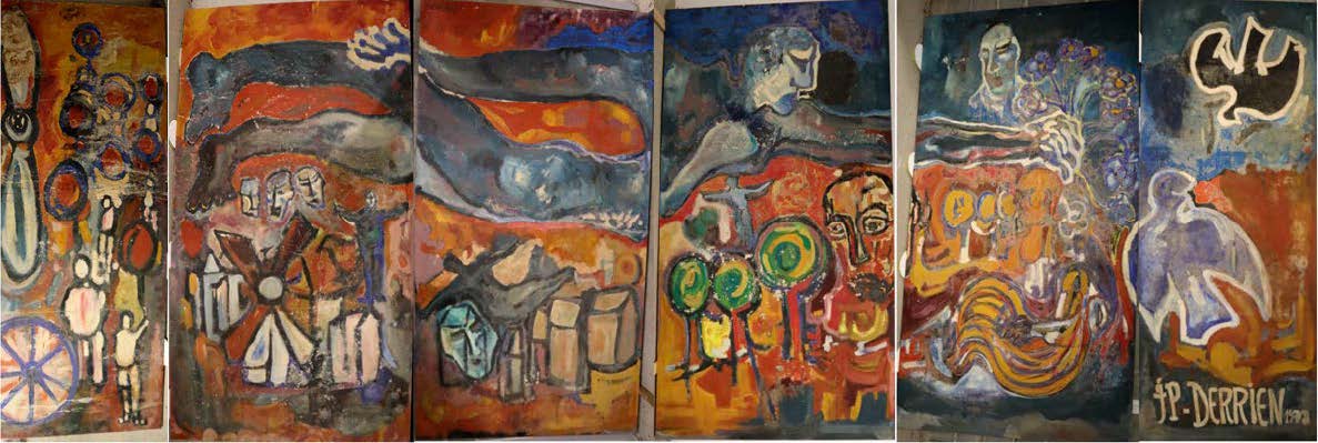 Dans la mythologie grecque, Icare est le fils de l’architecte athénien Dédale et de Naupacté, une esclave crétoise. Il est connu principalement pour être mort après avoir volé trop près du Soleil alors qu’il s’échappait du labyrinthe avec des ailes créées par son père avec de la cire et des plumes. La peinture de JP Derrien est constituée de 6 panneaux de contreplaqué bois. Les six panneaux sont situés au sous-sol de l’aéroport de Tontouta, exposés à l’humidité du fait d’une ventilation naturelle limitée.