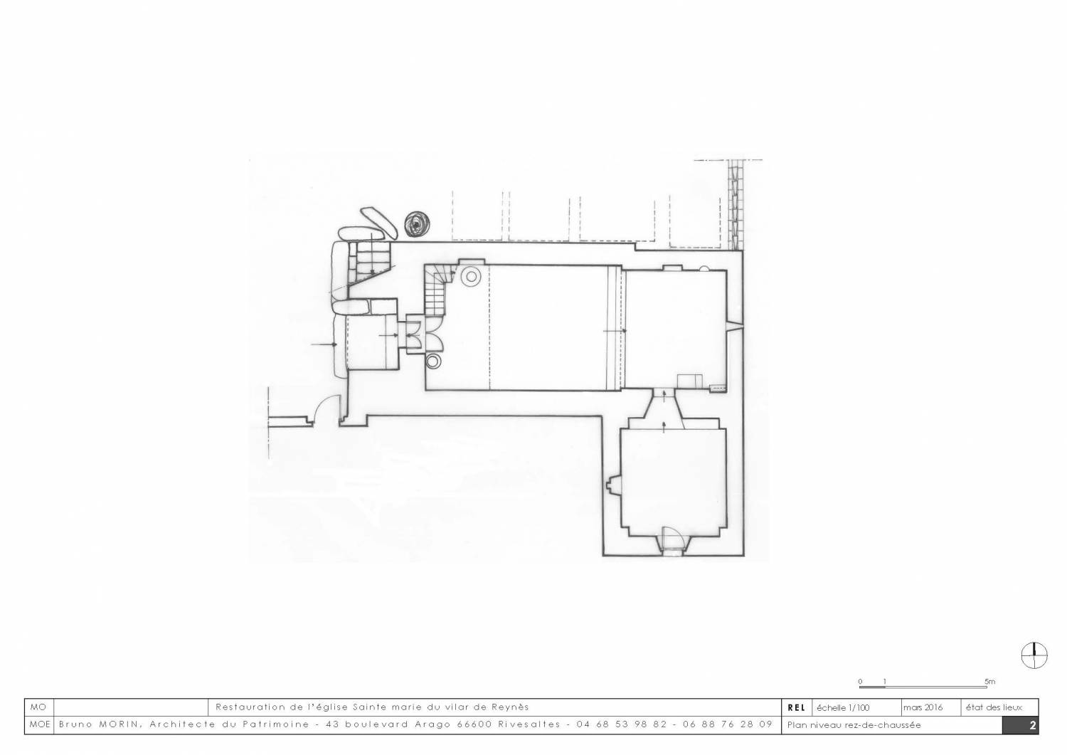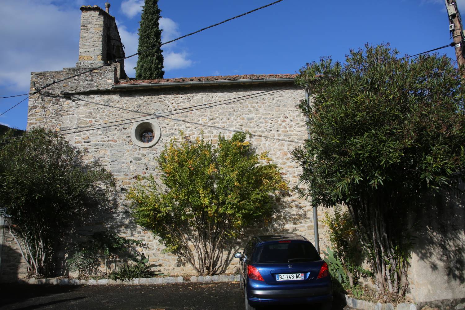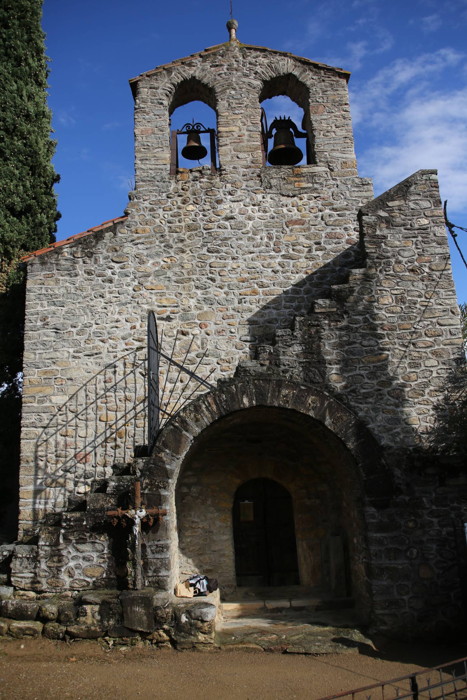 Un portail de pierre, à l’ouest est couvert en plein cintre et surmonté d’un escalier en pierre conduisant au clocher en arcade. Une sacristie adossée en appentis au sud du choeur.