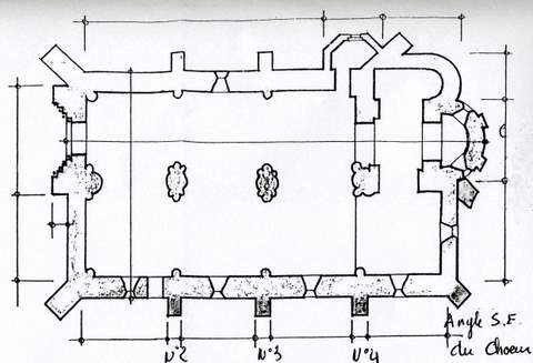 D’une ancienne construction romane subsistent aujourd’hui l’abside principale et une absidiole au nord, toutes deux voûtées en plein cintre et précédées d’une travée droite. Le reste du monument, c’est-à-dire la nef principale de trois travées et le bas-côté sud terminé par un chevet plat voûtés d’ogives, ainsi que le mur de façade appartiennent à l’époque gothique. Cependant les chercheurs ne sont pas unanimes quant à la datation de ces éléments : Marcel Génermont attribue le mur de la façade ouest de la nef à l’époque romane et le reste de l’édifice au XVe siècle. Anne Courtillé, plus prudente, propose le début de l’époque gothique pour le portail polylobé et peut-être pour l’ensemble de la reconstruction postérieure aux parties romanes.